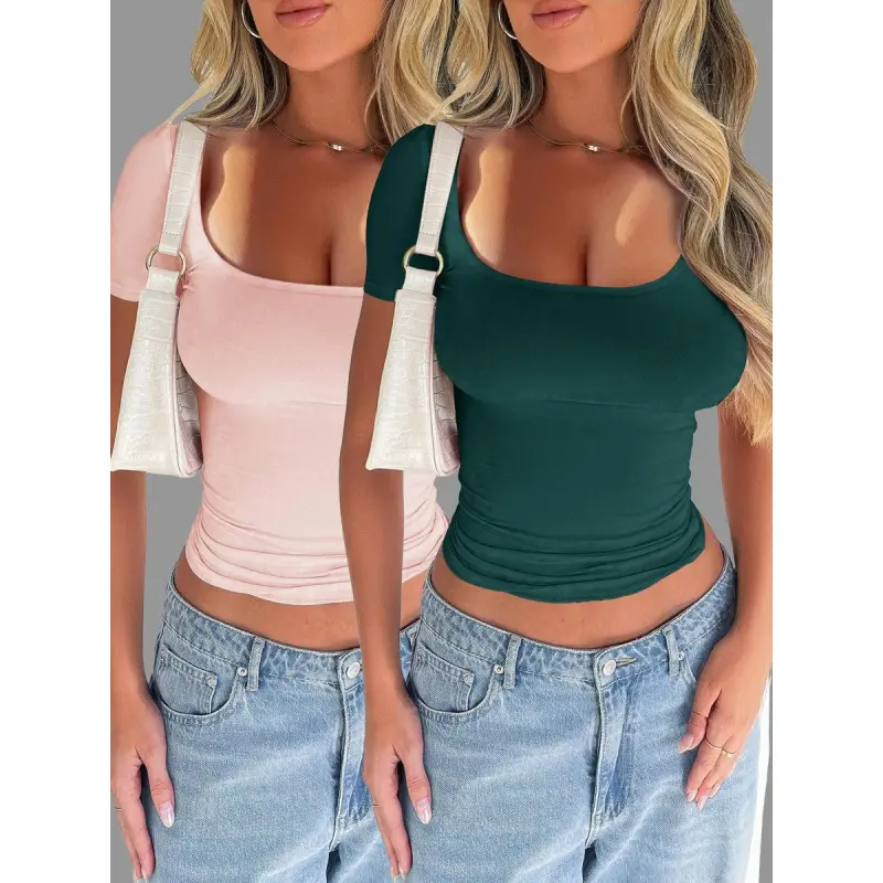 Pure Color Casual Slim Fit U Neck Short Sleeve T-Shirt, Summer Thin Fabric Kint Style Tee for Women, Comfortable Daily Wear