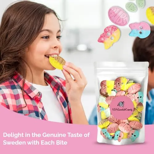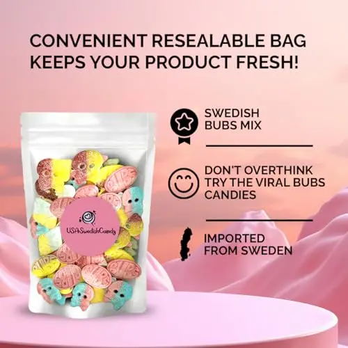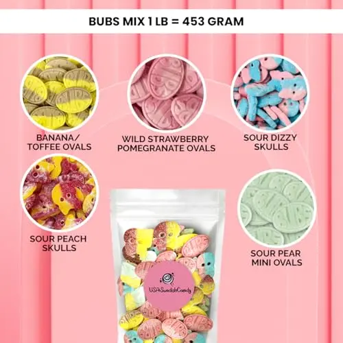 Bubs Candy Mix – Authentic Swedish Treats 🇸🇪 – Enjoy 1 pound of delicious Bubs candy straight from Sweden! Each bag is packed with a fun assortment of sweet and sour gummies in playful shapes like big ovals and skulls for a unique candy experience.