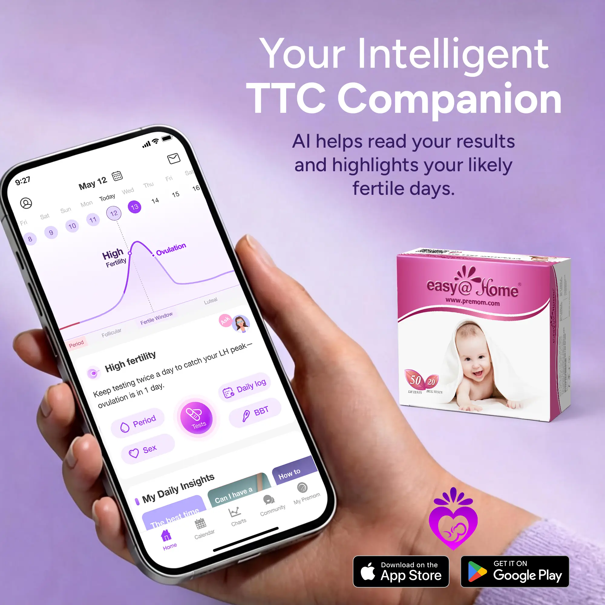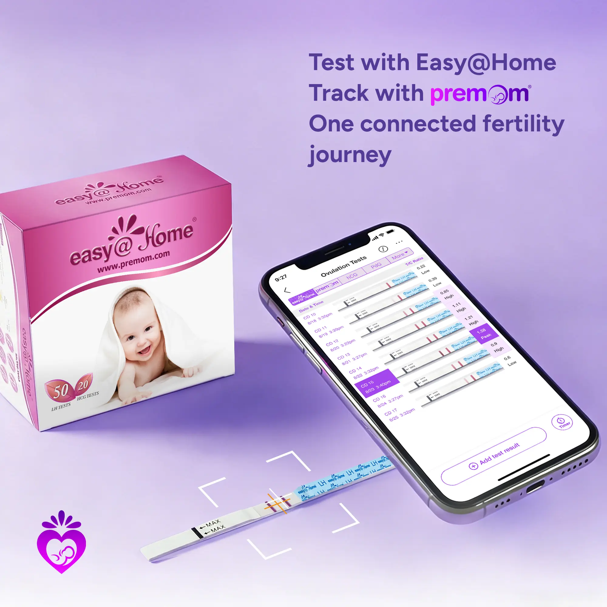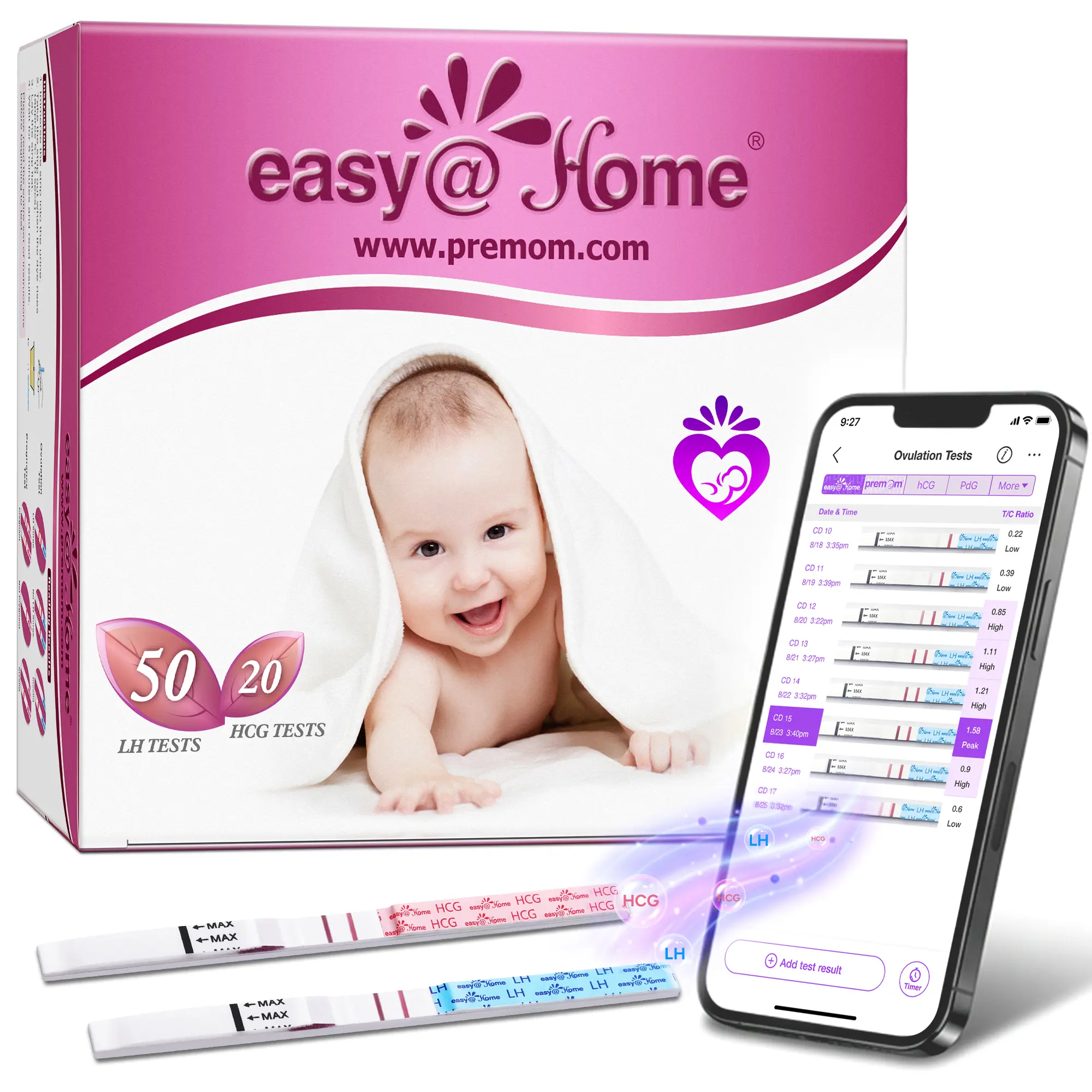 Designed for "Trying to Conceive" (TTC) women, our Easy@Home Ovulation & Pregnancy combo kit offers the ultimate convenience and value in one package. Pair these cost-effective strips with the smart Premom App to monitor your cycle seamlessly. We are proud to share that 1.5 Million+ Users Have Gotten Pregnant While Using Premom!*