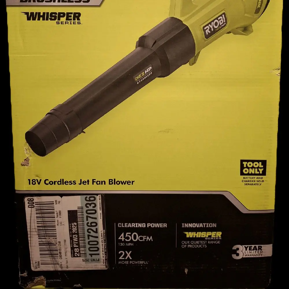 The RYOBI 18V ONE+ HP Brushless Whisperer Series is a cordless jet fan blower. It delivers 450CFM, ensuring strong airflow. This advanced technology is perfect for various tasks requiring high performance. The brushless design enhances efficiency and reduces noise. Ideal for professionals and DIY enthusiasts.