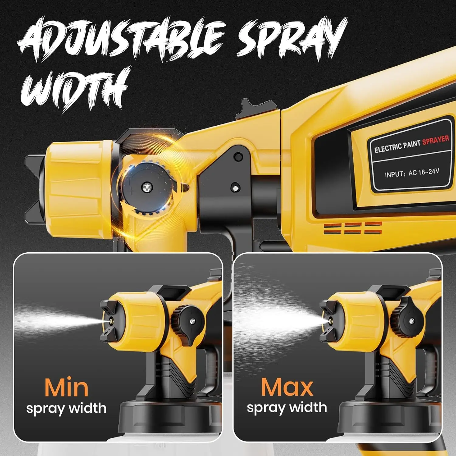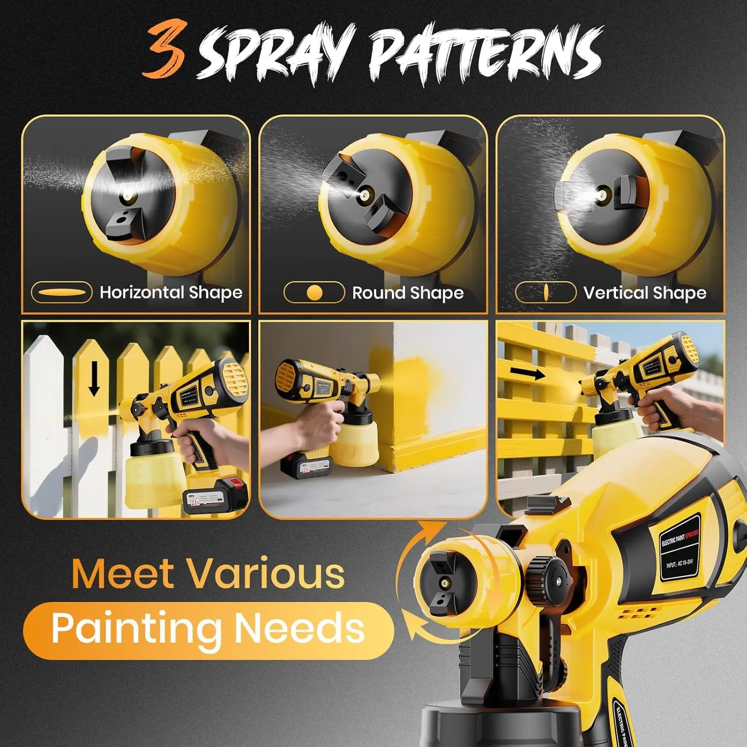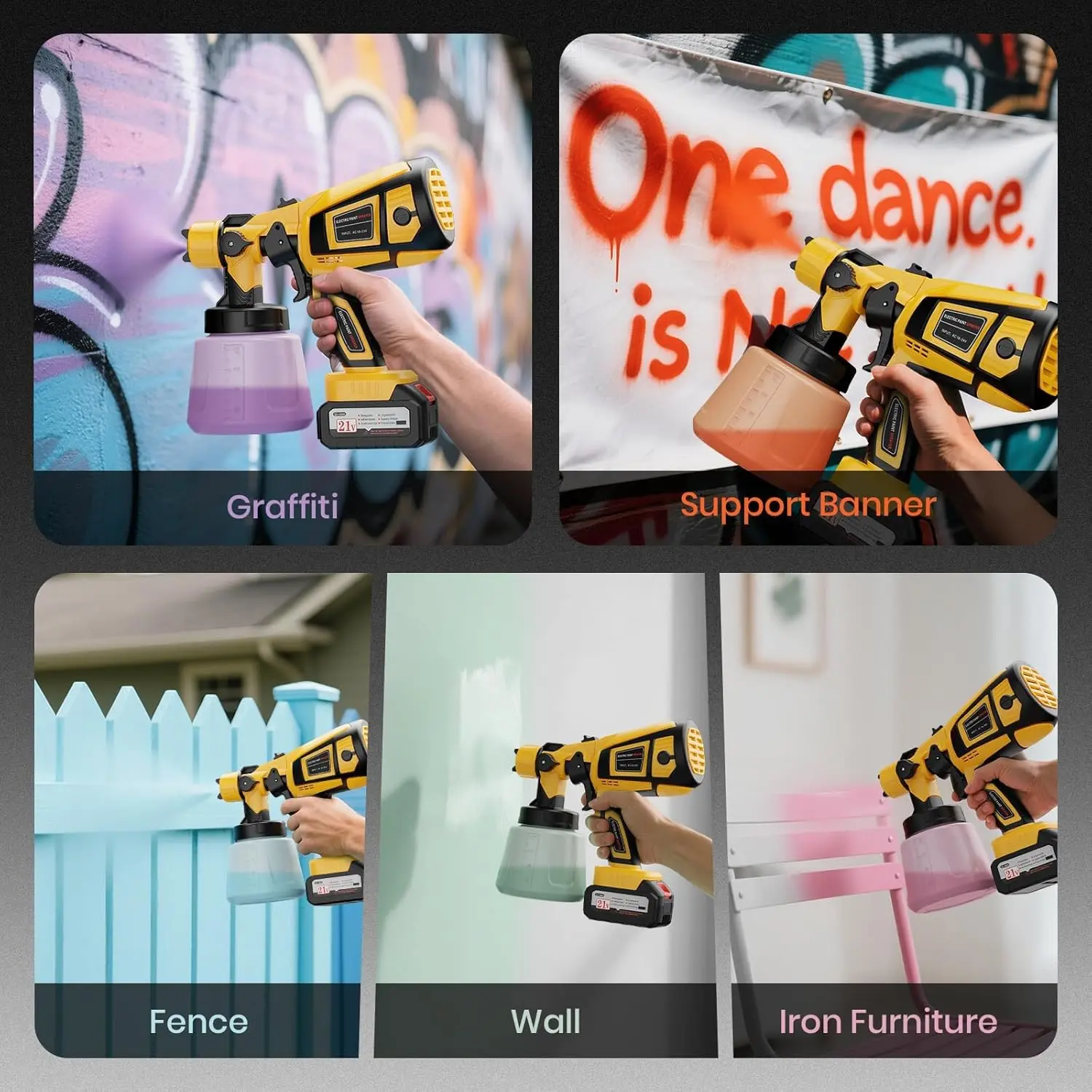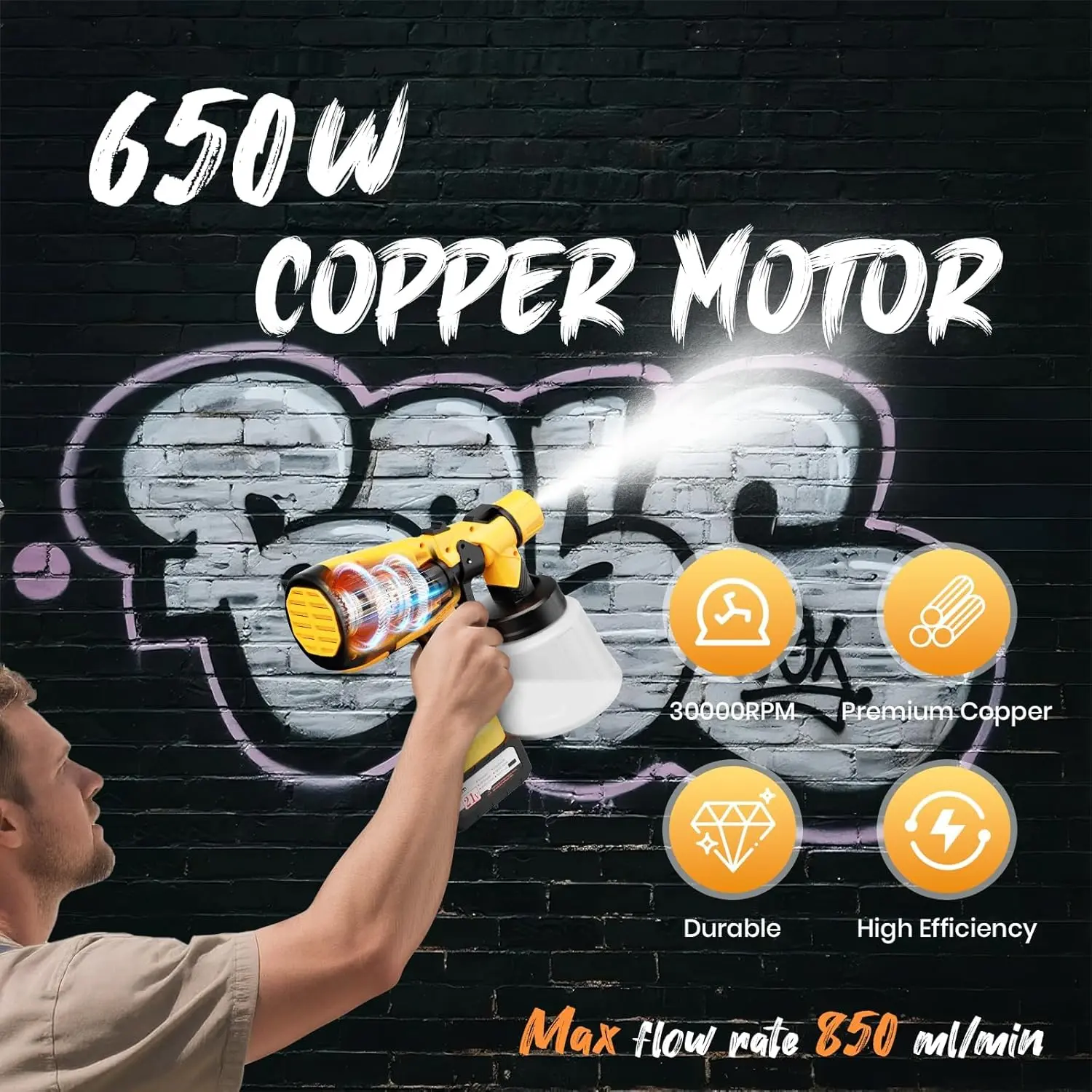 [Powerful Paint Sprayer]This paint sprayer is equipped with a 650w high-power copper motor with a max flow rate of 850ml/min, which can cover an area of 200-480sq.ft in 15 minutes, allowing you to say goodbye to time-consuming and labor-intensive rollers/brushes.Not only that, its spraying effect is also significantly improved, the spraying is more even and delicate[Cordless Paint Sprayer]Forget the hassle of tangled cords-this paint sprayer for house painting comes with two 4000mAh rechargeable batteries, each delivering up to 15 minutes of powerful, uninterrupted spraying.Perfect for tackling large projects outdoors without being tied down[Customizable Spray]Designed as a professional-grade HVLP spray gun, it includes 6 durable, corrosion-resistant brass nozzles (0.5mm to 2.5mm) for various paint types and viscosities.Effortlessly switch between horizontal, vertical, and circular spray patterns for various surface types.Fine-tune your results further using the spray width and flow control knobs to achieve smooth, even coverage from tight corners to wide surfaces[Quick Disassembly & Cleanup]Cleaning is fast and effortless thanks to the user-friendly design-just press the top disassembly button and twist to separate the sprayer body.Flush out remaining paint and use the included brush and needle to remove any buildup.Tip: Regular cleaning helps prevent clogging, maintain optimal performance, and extend the life of your electric sprayer[All-in-one Package]Comes with everything you need: 1 powerful paint sprayer, 2 batteries, 6 brass nozzles, 1 funnel, 5 filters, 1 cleaning brush, 1 unclogging needle, and a US standard charger.Keep your tools in top shape and ready for every jobNozzle installation and leak-proof adjustment: When installing the nozzle assembly, the sealing gasket should be inserted into the back of the nozzle. Check the limit groove when installing the nozzle. You need to rotate the nozzle so that it snaps into the groove correctly to achieve a sealing and anti-leakage effect.