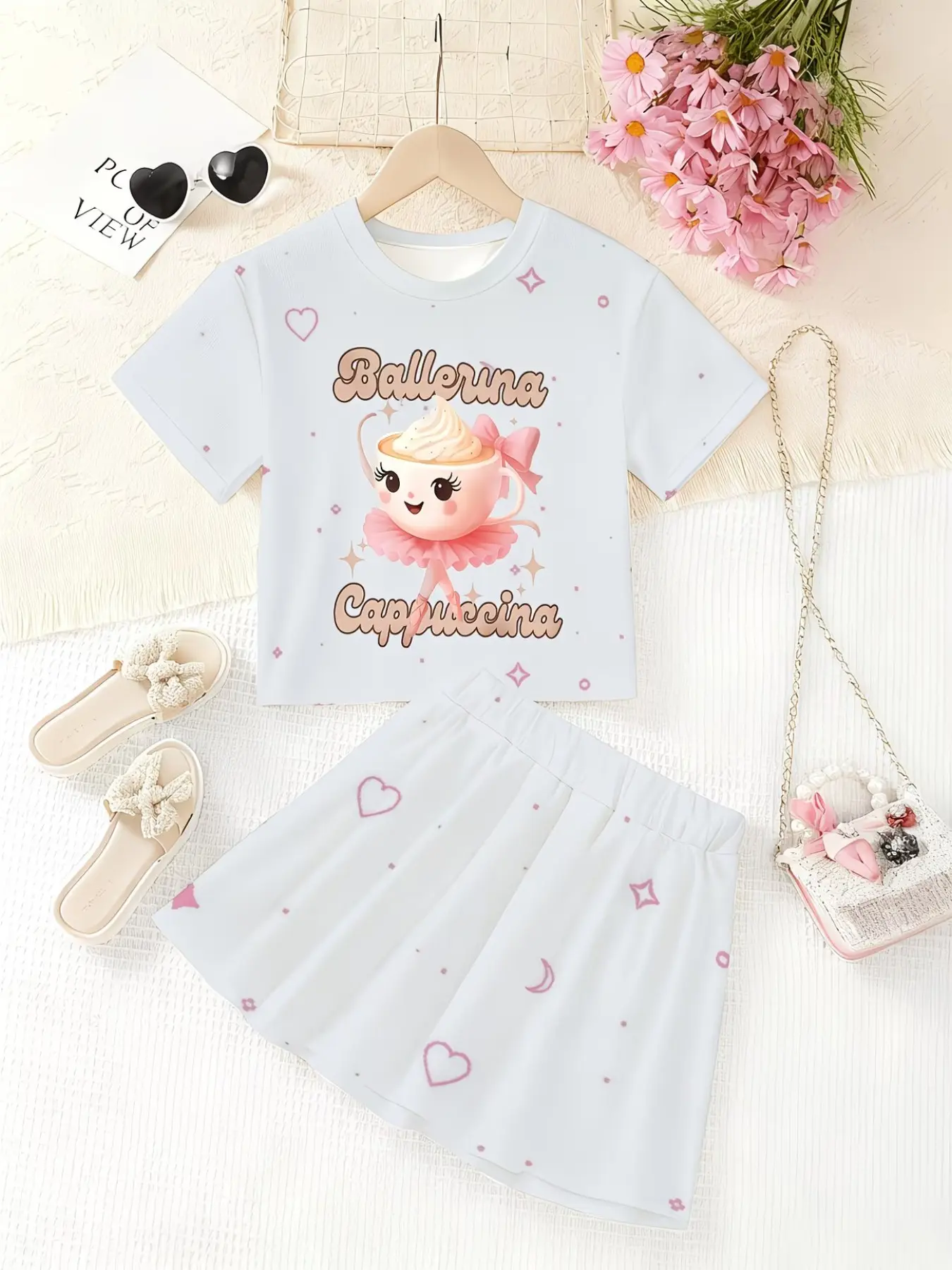 Girls' 3D Cartoon Print Top and Skirt Set, Summer Casual Slim-Fit, Round Neck Short Sleeve, Daily Wear for Kids
