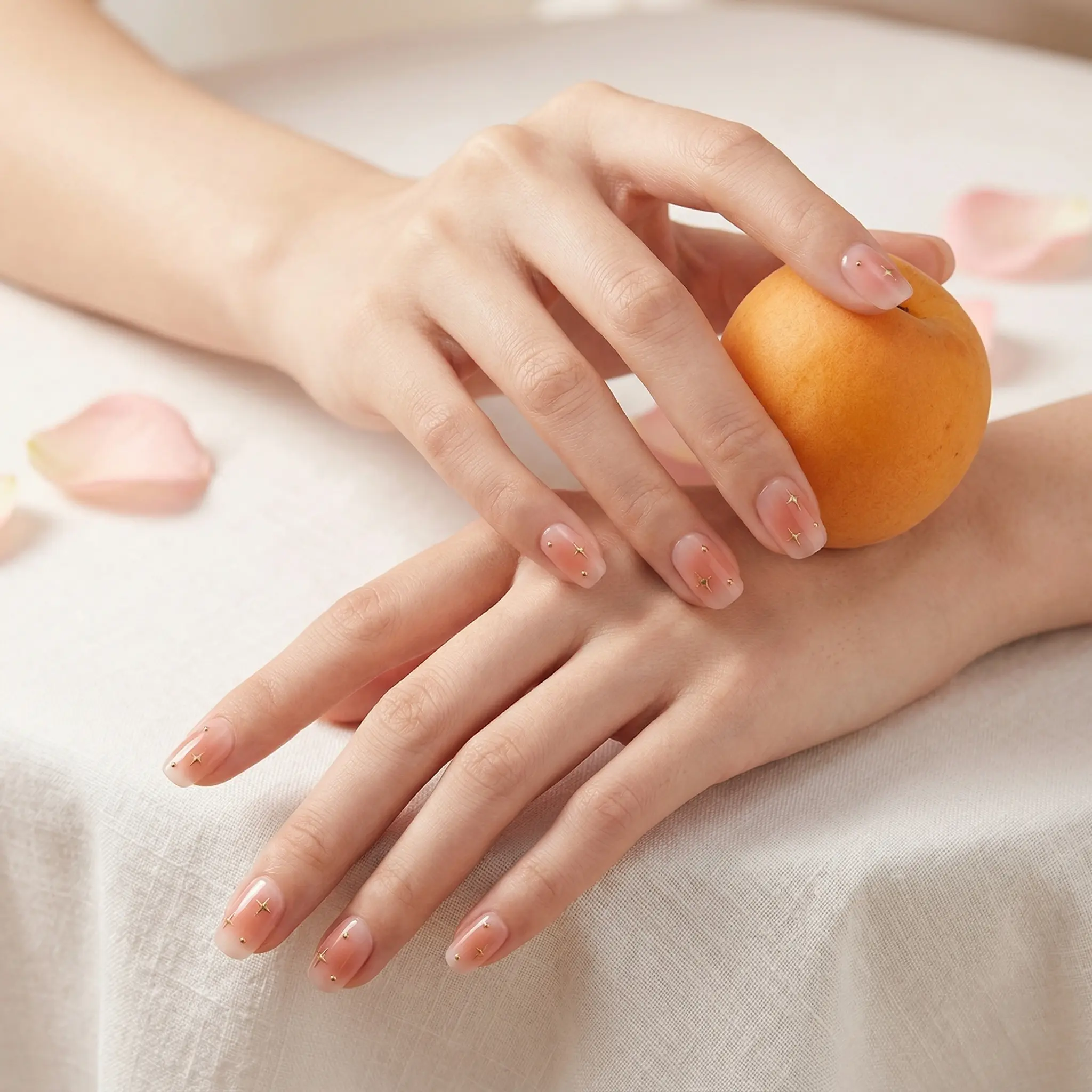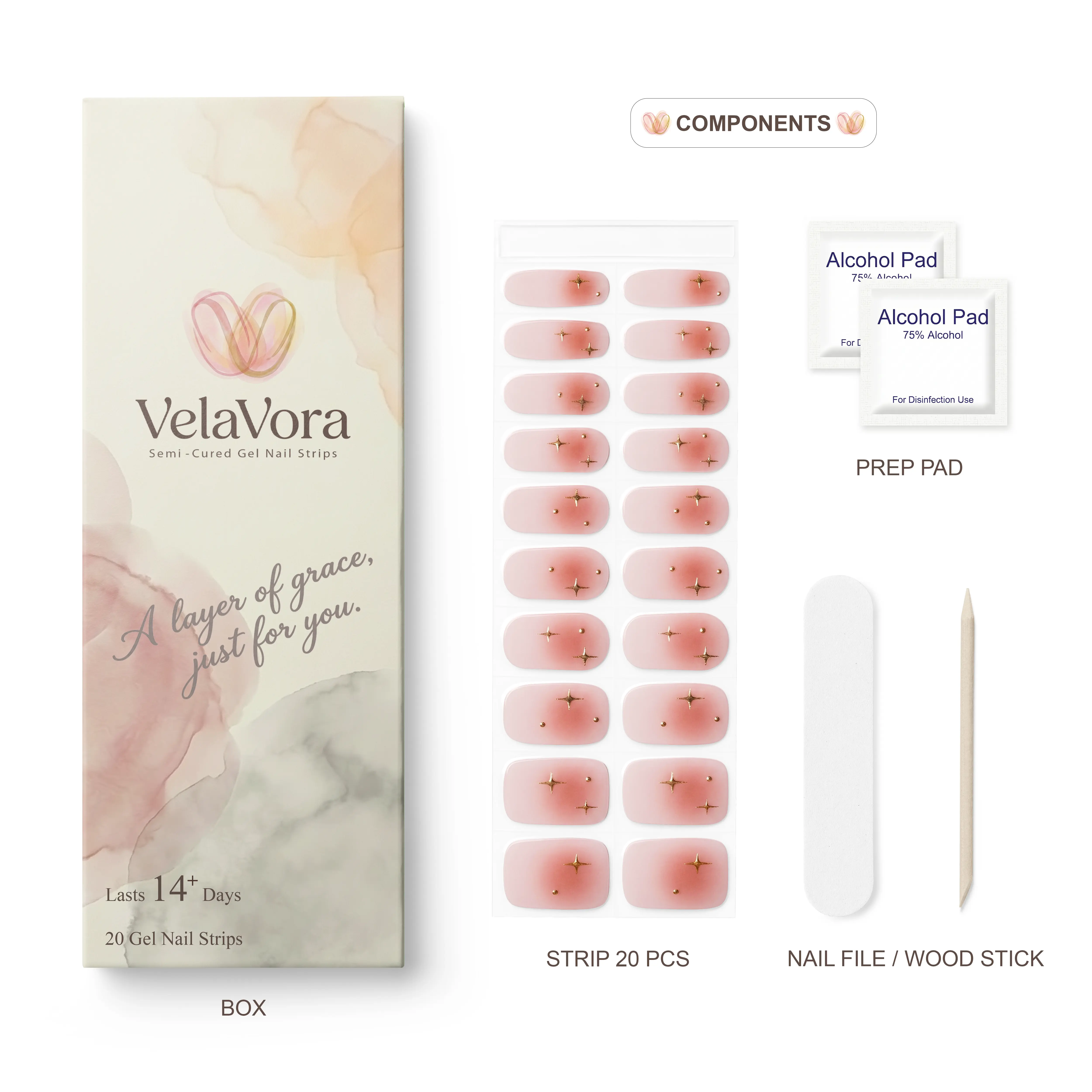 Experience a professional, salon-quality manicure at home with our Starry Syrup Semi-Cured Gel Nail Strips. This design features soft Blush Gradients paired with a high-gloss Jelly Finish, incorporating golden Star Accents that perfectly captures the essence of a romantic twilight sky.