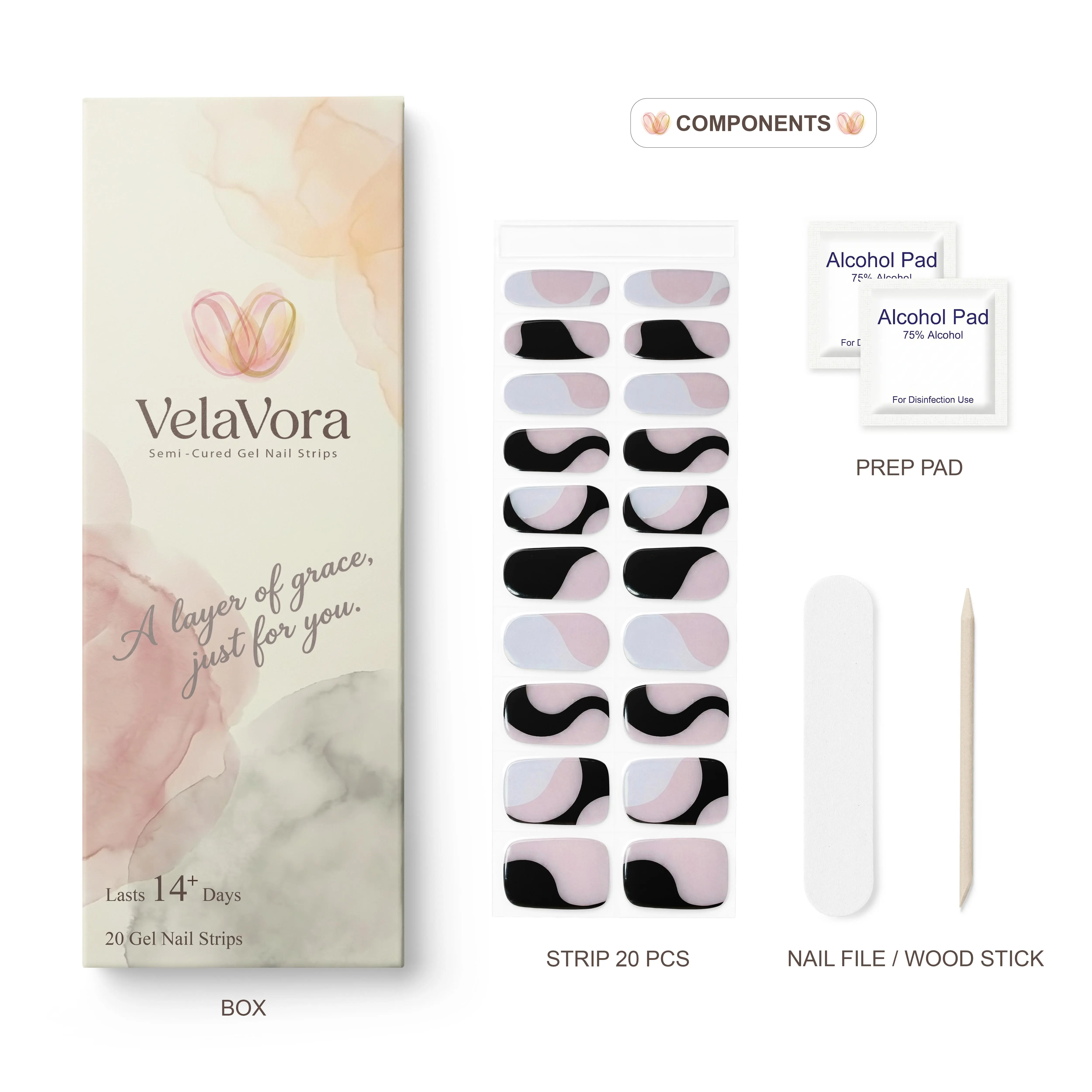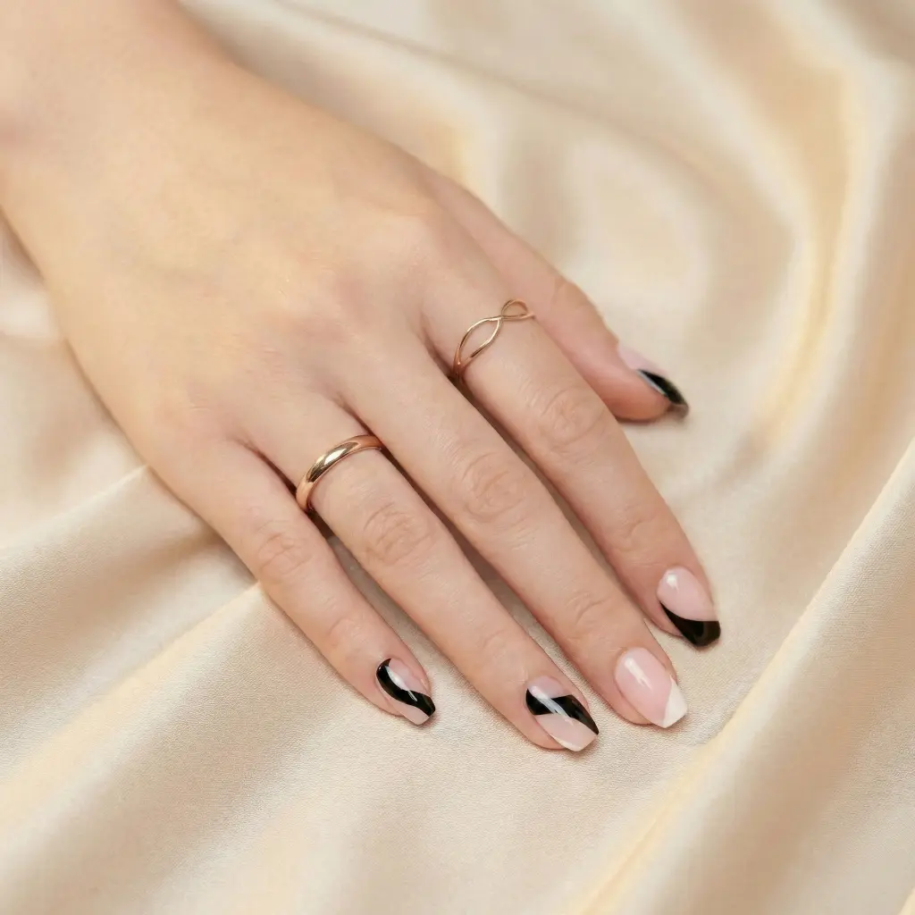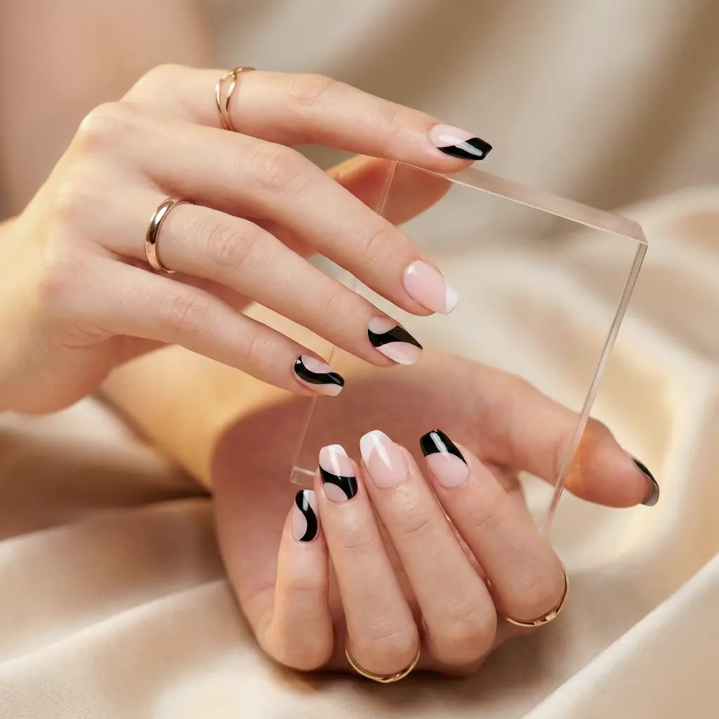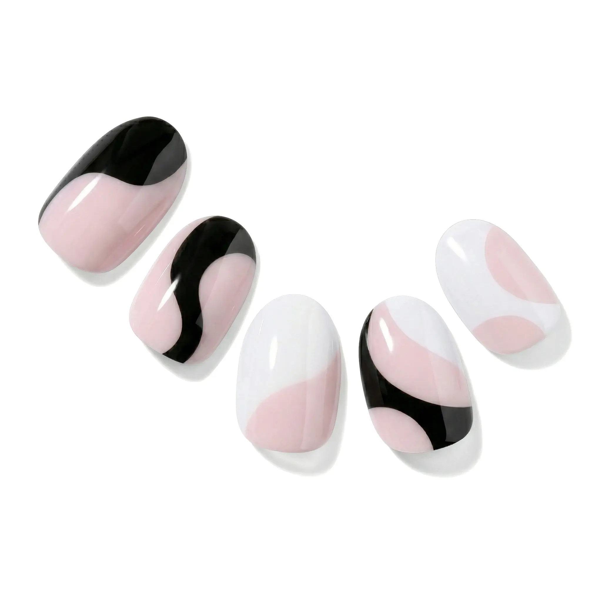 Experience a professional, salon-quality manicure at home with our Wavy Trio Semi-Cured Gel Nail Strips. This design features nude pink paired with bold black and white, incorporating abstract waves that perfectly capture the essence of modern minimalist art.