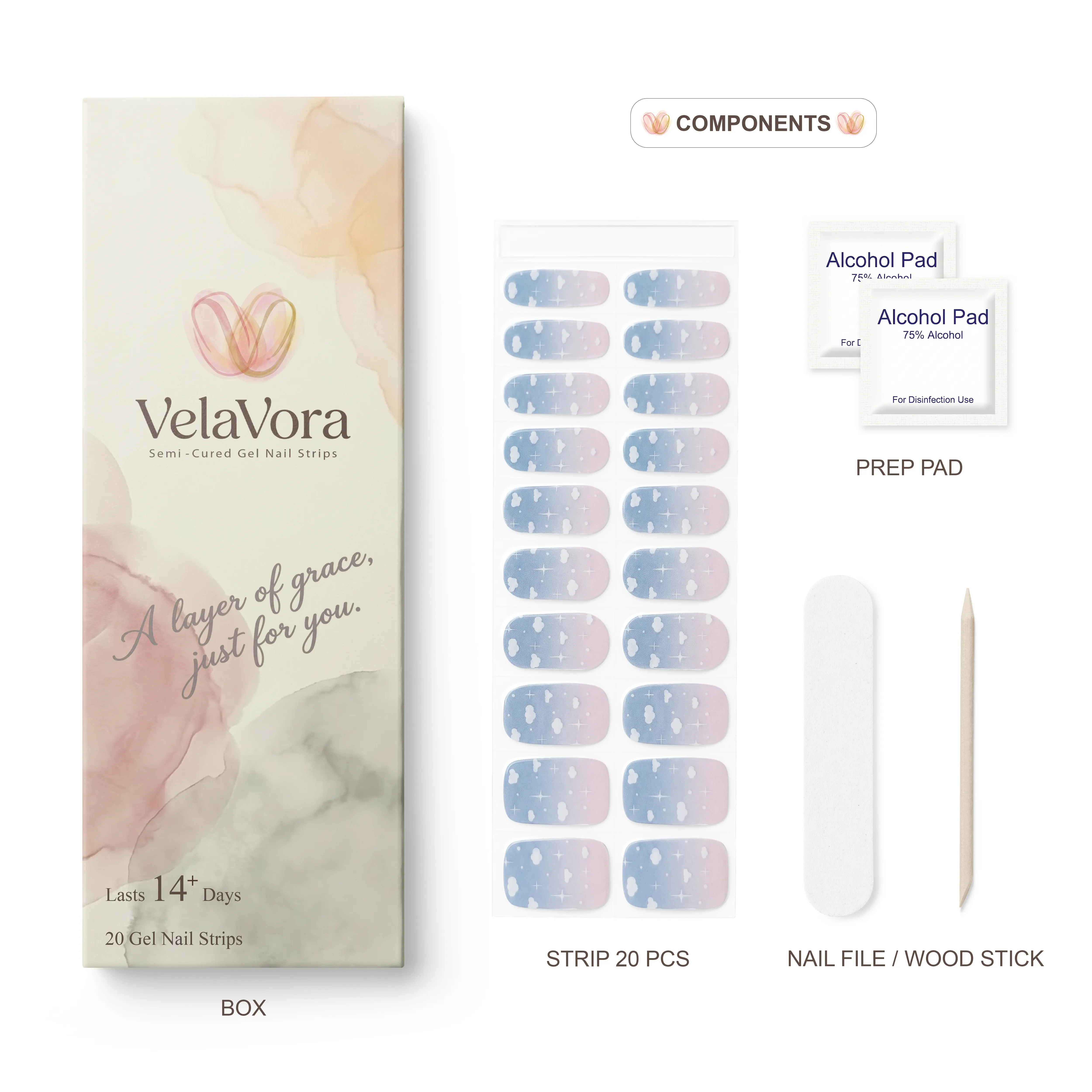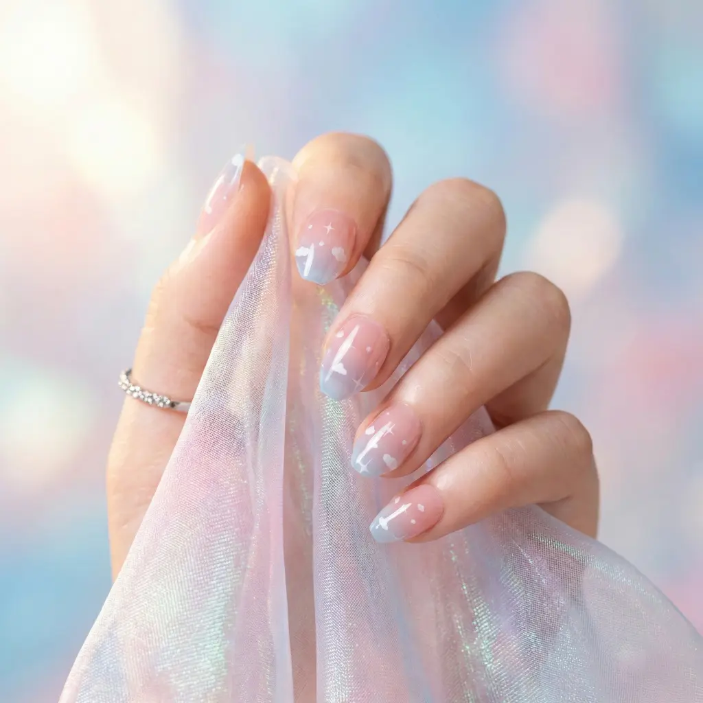 Experience a professional, salon-quality manicure at home with our Daydream Sky Semi-Cured Gel Nail Strips. This design features Soft Pink paired with Sky Blue Ombre, incorporating delicate clouds and stars that perfectly captures the essence of ethereal daydreams.