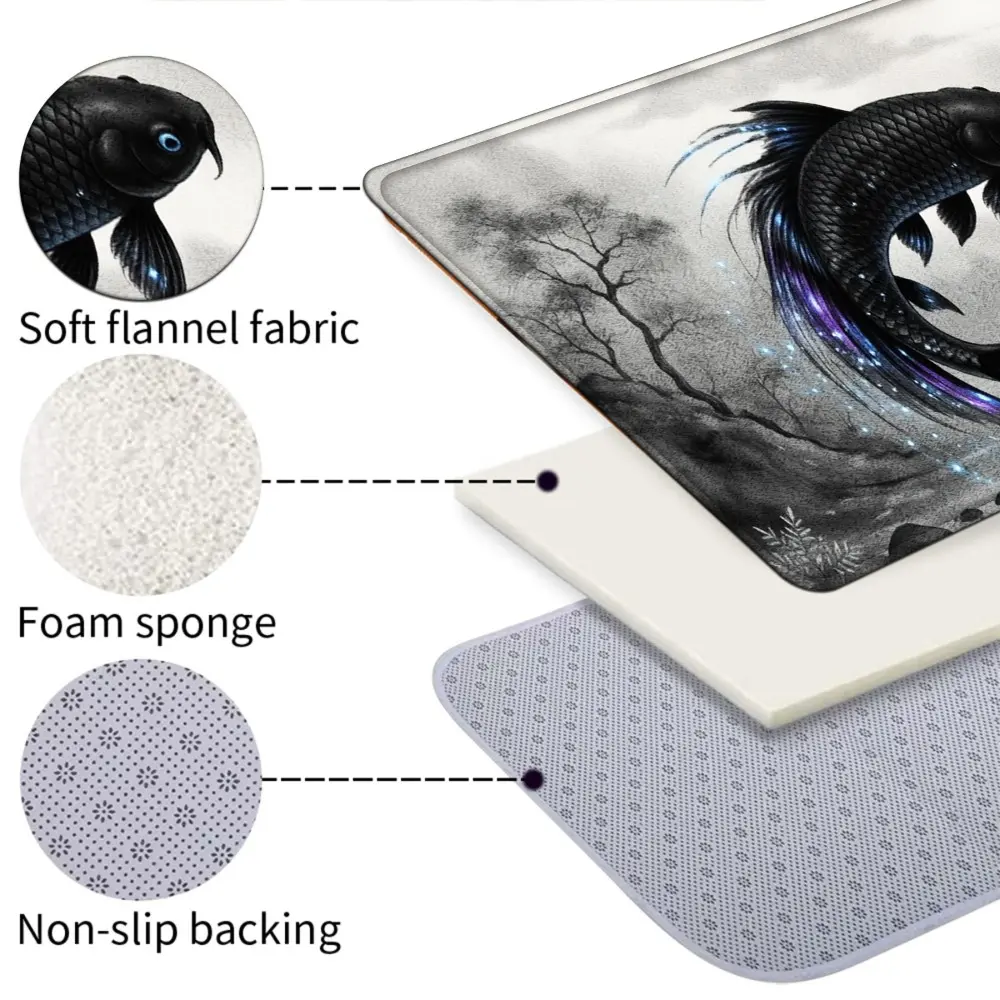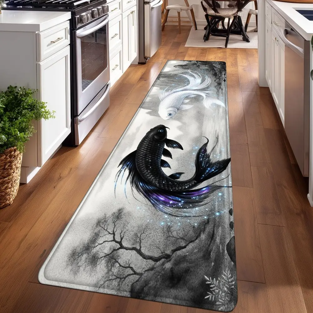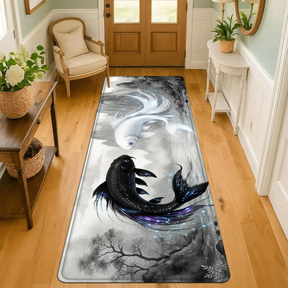 1PC, Black and White Double Fish in Ink - Wash Style Patterned strip rugs, home décor, bathroom mats, entryway mats, bathroom non-slip mats, indoor entrance rugs, bedroom bedside mats, kitchen mats, hallway rugs, flannel sponge rugs, hallway runner rugs
