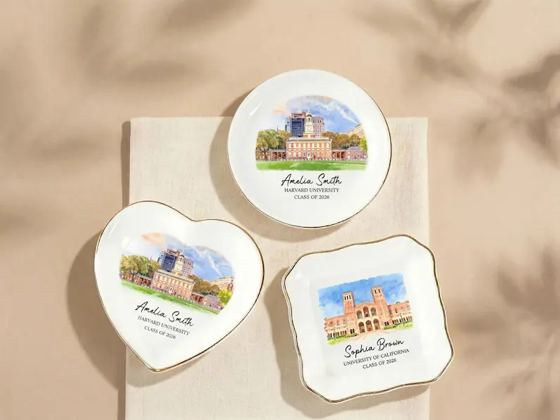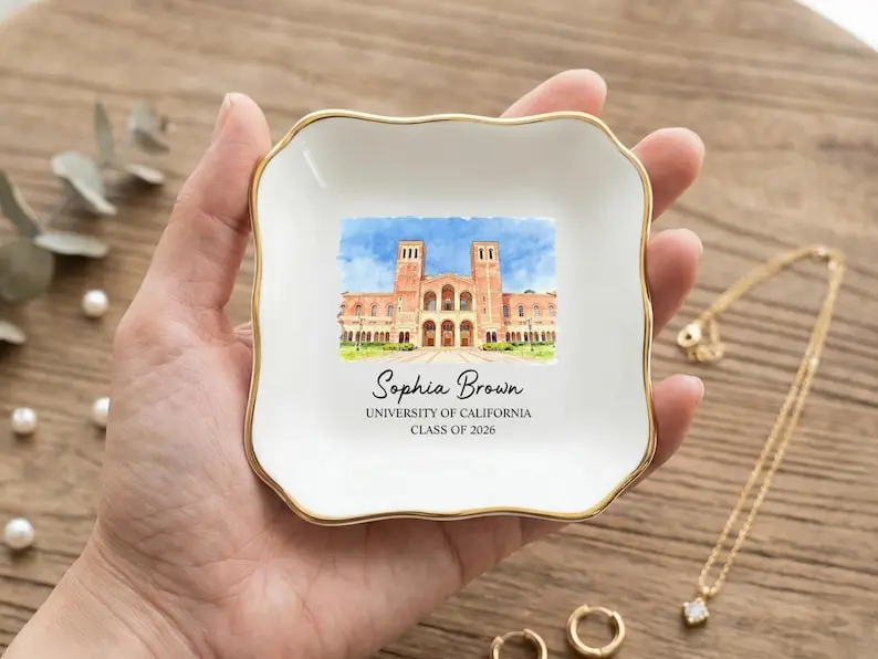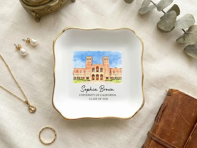 This personalized ceramic jewelry dish is customized with your school details, name, and graduation year, turning a simple ring dish into a meaningful college keepsake. Whether you are shopping for a daughter, best friend, roommate, or graduate, this custom dish is a beautiful way to honor a special milestone.