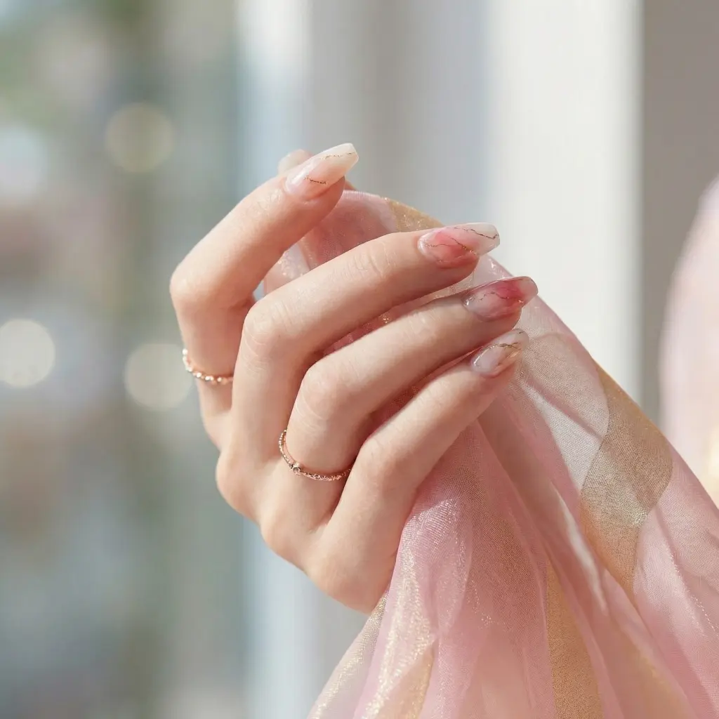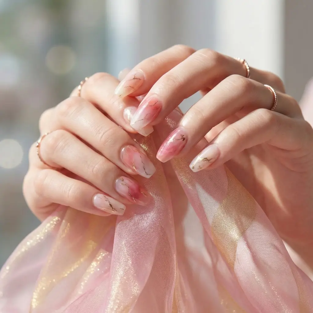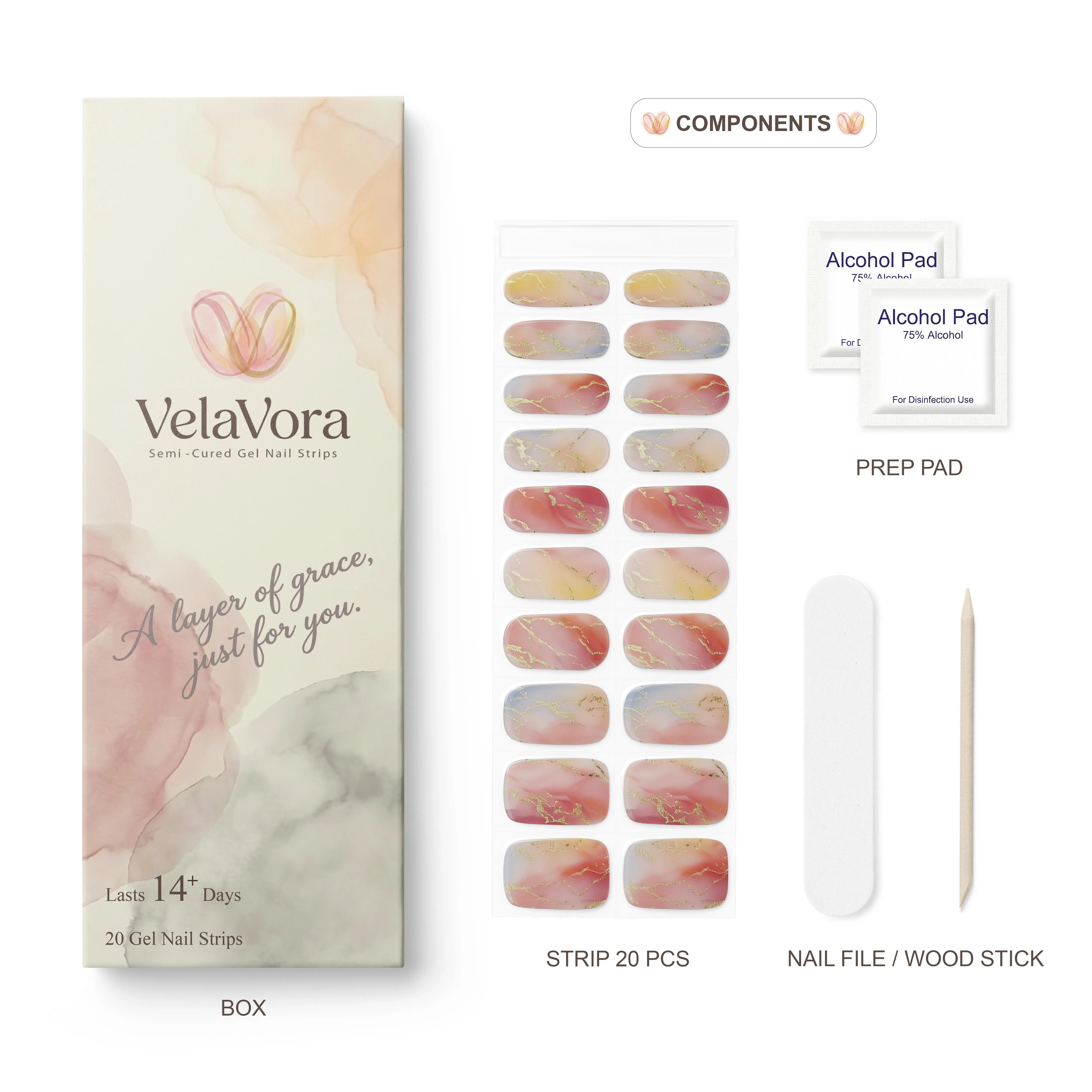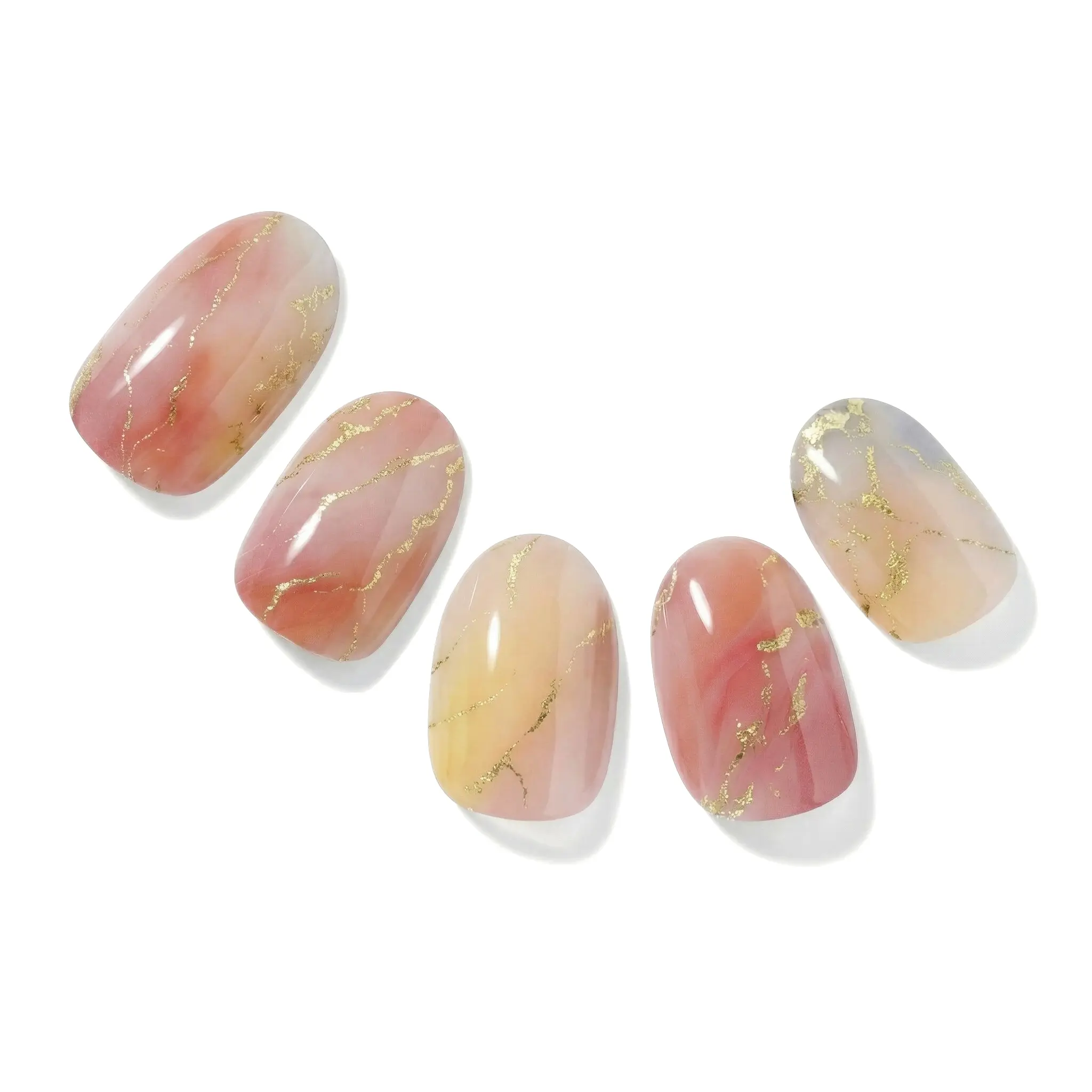 Experience a professional, salon-quality manicure at home with our Peach Drift Semi-Cured Gel Nail Strips. This design features soft pink paired with sun-kissed yellow, incorporating delicate gold foil marbling that perfectly captures the essence of a radiant, glowing sunrise.