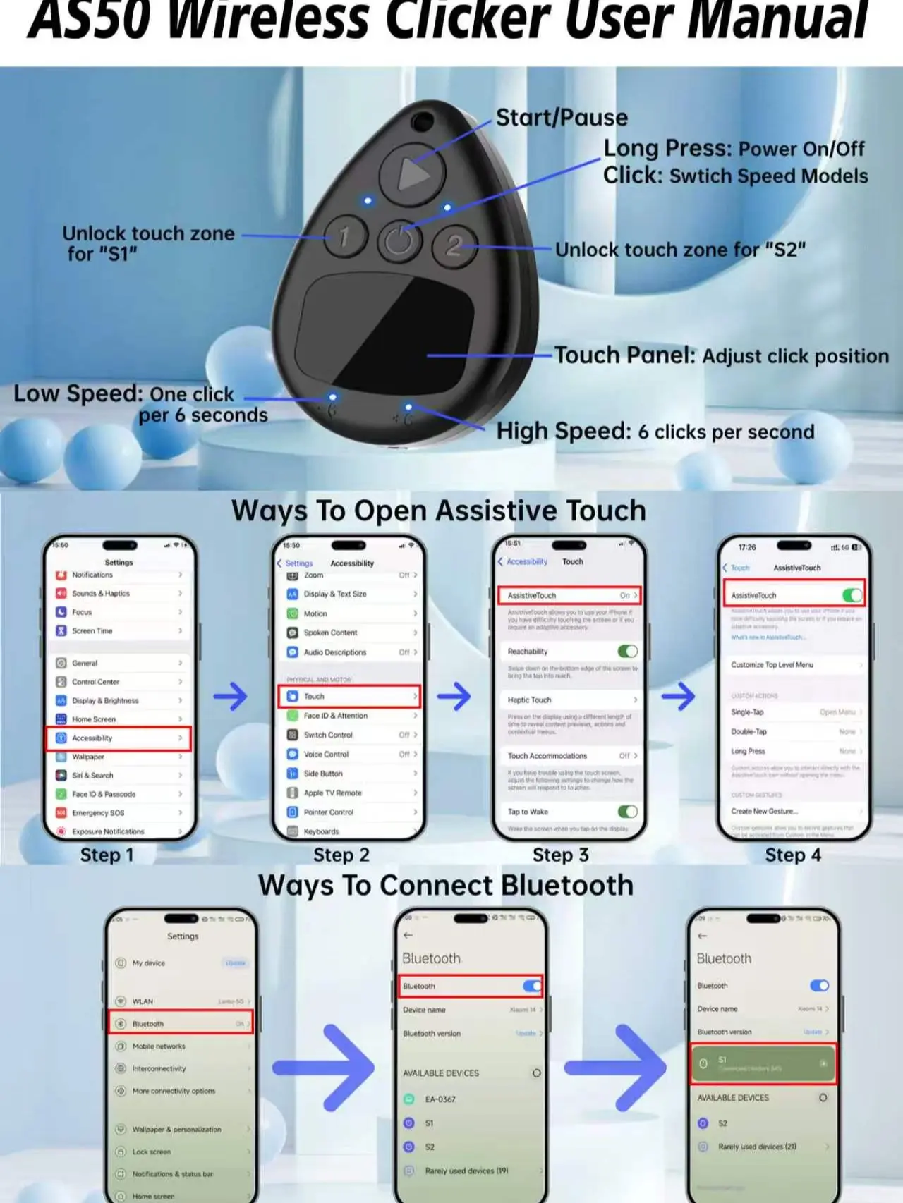 Wireless Auto Clicker for iPhone, Bluetooth Phone Screen Tapper with Battery for Hands Free, Silent & Adjustable Speed Finger Clicker for Tiktok Live Broadcasts Likes, Gaming, Reward Task