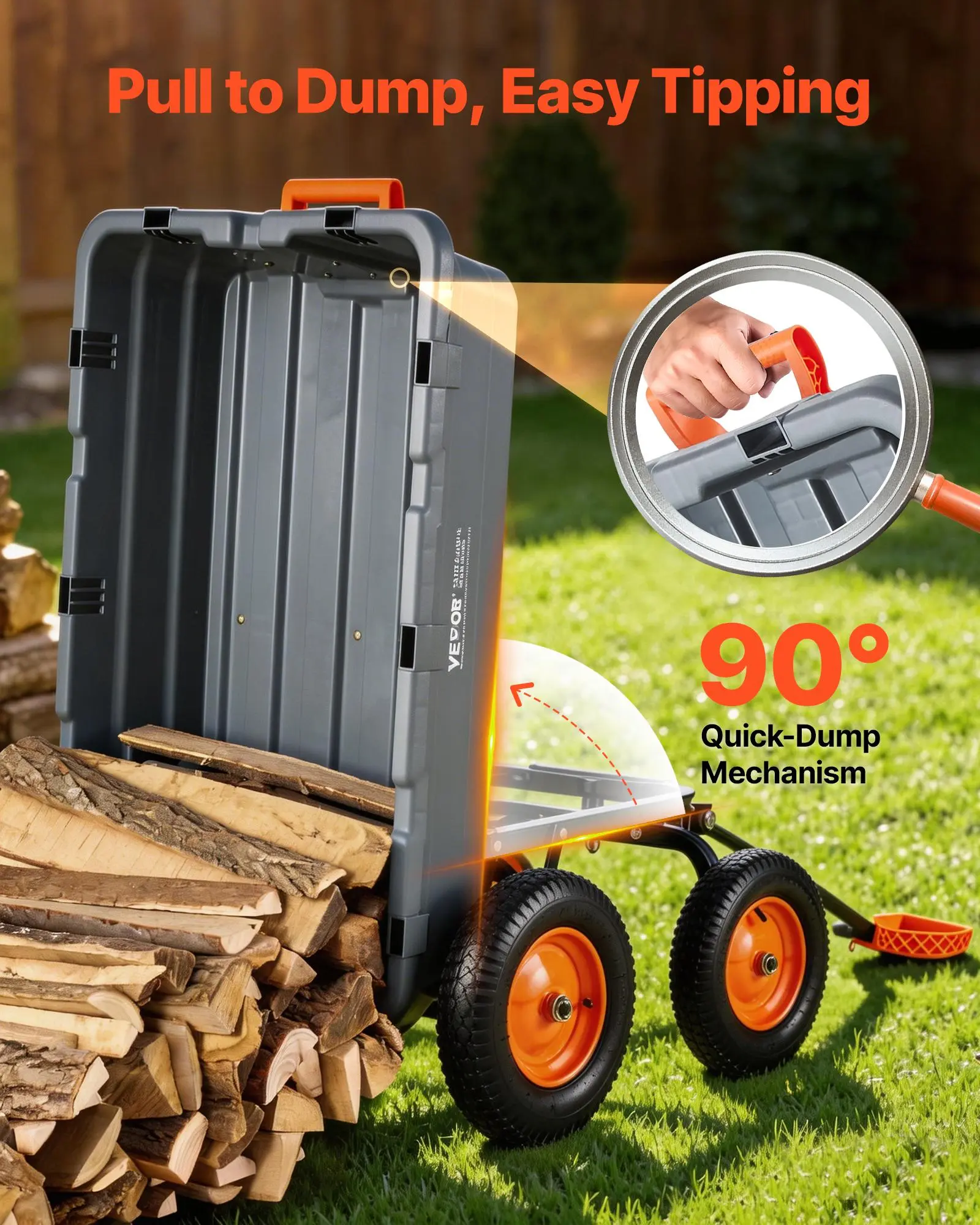 Smooth Turning Support: With a rotating handle and 270° swivel wheels, this garden dump cart wagon stays easy to guide when filled, letting you turn, back out, or shift through narrow paths with less strain