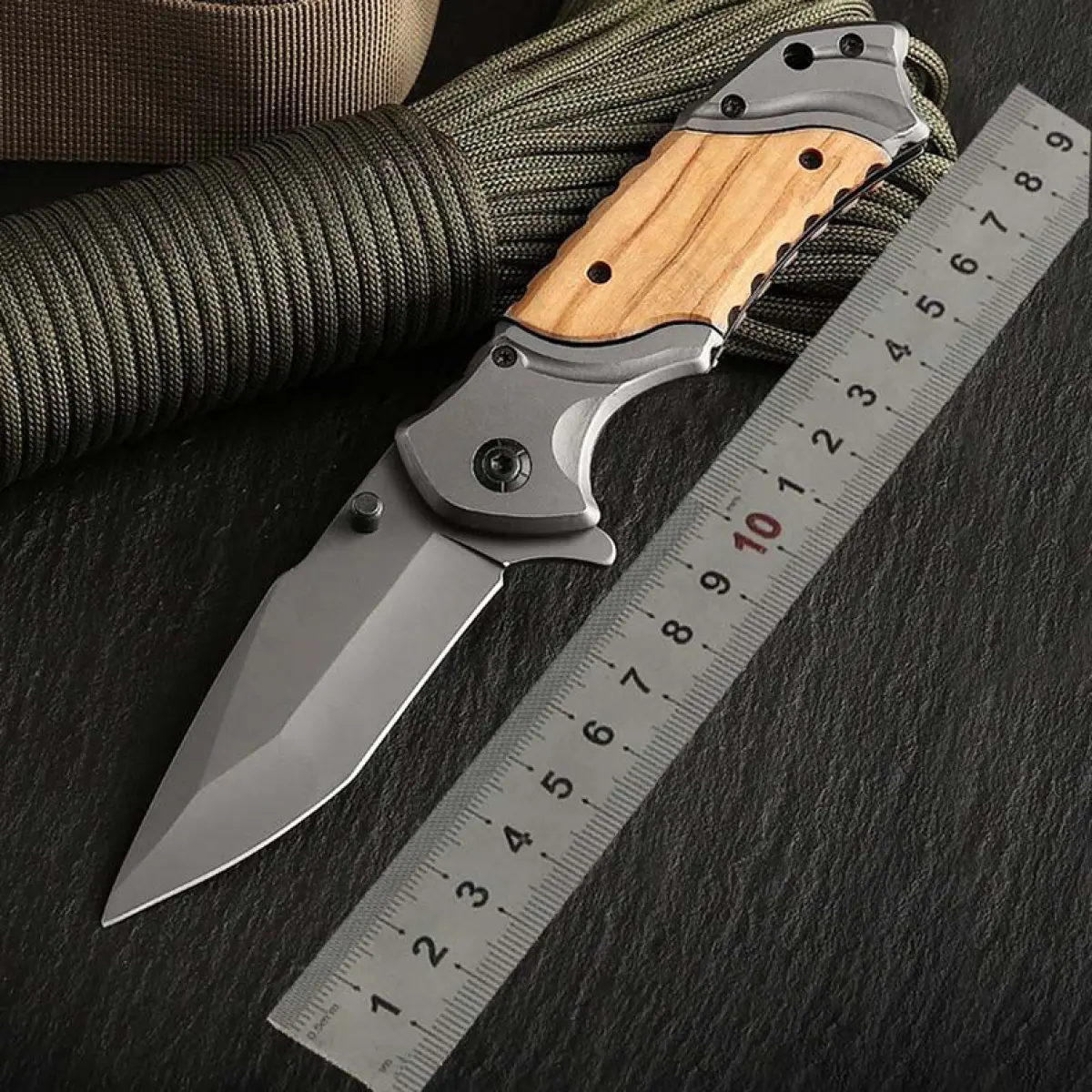 Total length: 19.8cm Blade length: 8.2cm Blade width: 2.8cm (widest point) Handle length: 11.6cm Surface: Grey Titanium Blade material: 440C Hardness: 57HRC Handle material: All steel semi solid olive wood chips