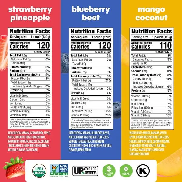 ·PLANT-BASED ORGANIC SNACKS: Our smoothies are made with a delicious & refreshing blends of strawberries, blueberries, blackberries, cherries, mangos, pineapples and bananas. Great on-the-go alternative to energy bars and gels, and dried fruit.