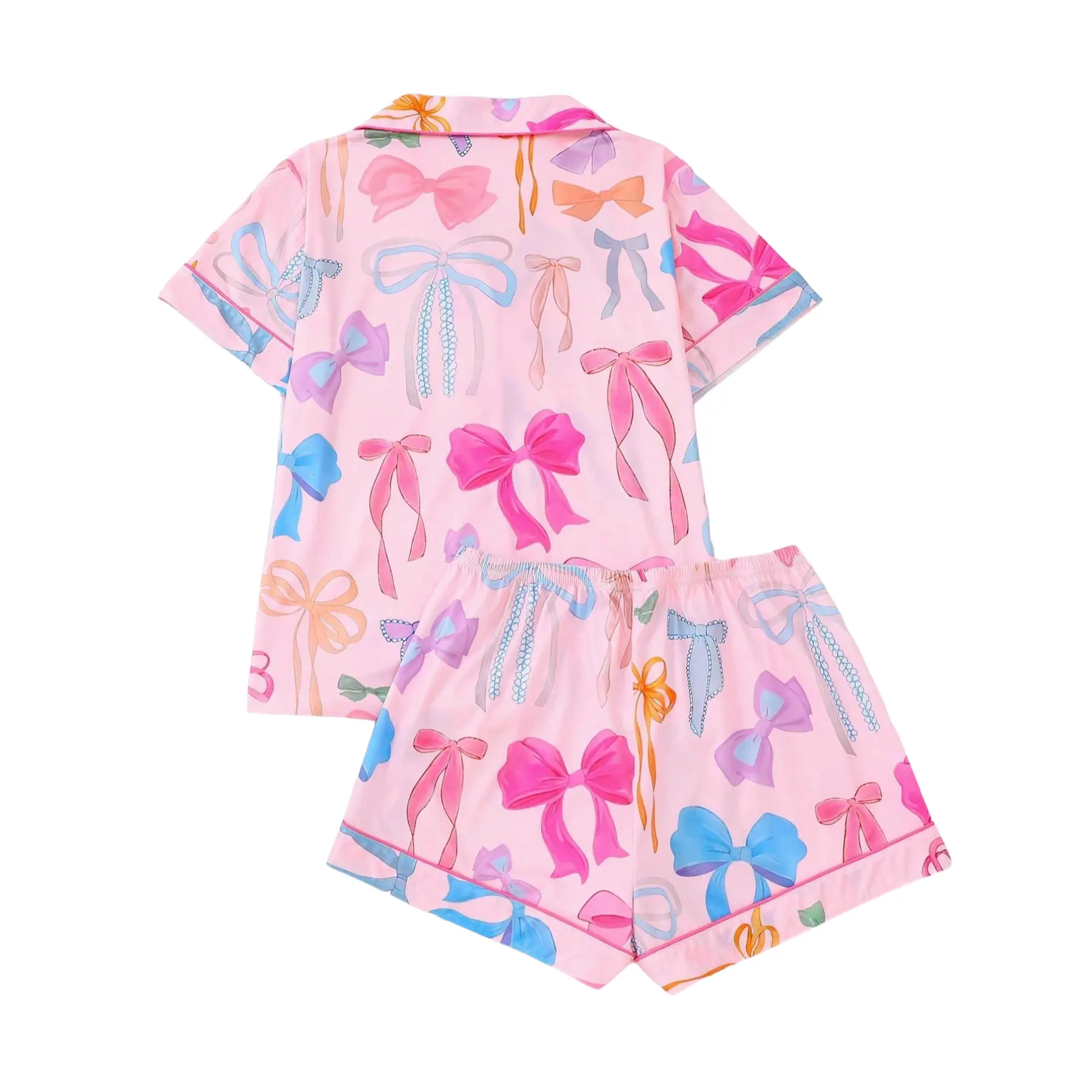 Women's All Over Bow Print Button Front Long & Shorts Pyjama Set, Comfort Two-piece Pj Set for Homewear, Women's Sleepwear for All Seasons, Summer Sleepwear, Pajamas, Pajamas Lounge Set