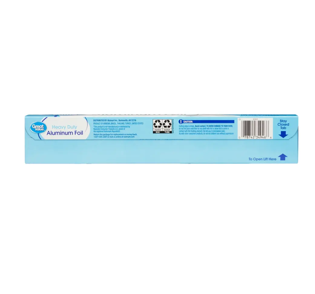 Streamline your cooking, grilling, and baking with our Great Value Heavy Duty Aluminum Foil. Tough enough to withstand the heat of your grill or oven, you can use this foil as an insulator to keep prepared food toasty or use it as a pan liner to make after-dinner clean-up a breeze. If you're looking for an alternate way to safely store your leftovers, just wrap them up in our aluminum foil prior to freezing or refrigeration for a quick and convenient storage solution. Each box includes locking ends and a sharp, serrated cutting edge that makes it super simple to grab the right amount of foil for the project at hand. Plus, the stay-closed tab keeps your foil box closed while not in use. Discover all your new cooking, grilling, and baking possibilities with our Great Value Heavy Duty Aluminum Foil. Great Value products provide families with affordable, high-quality grocery and household consumable options.