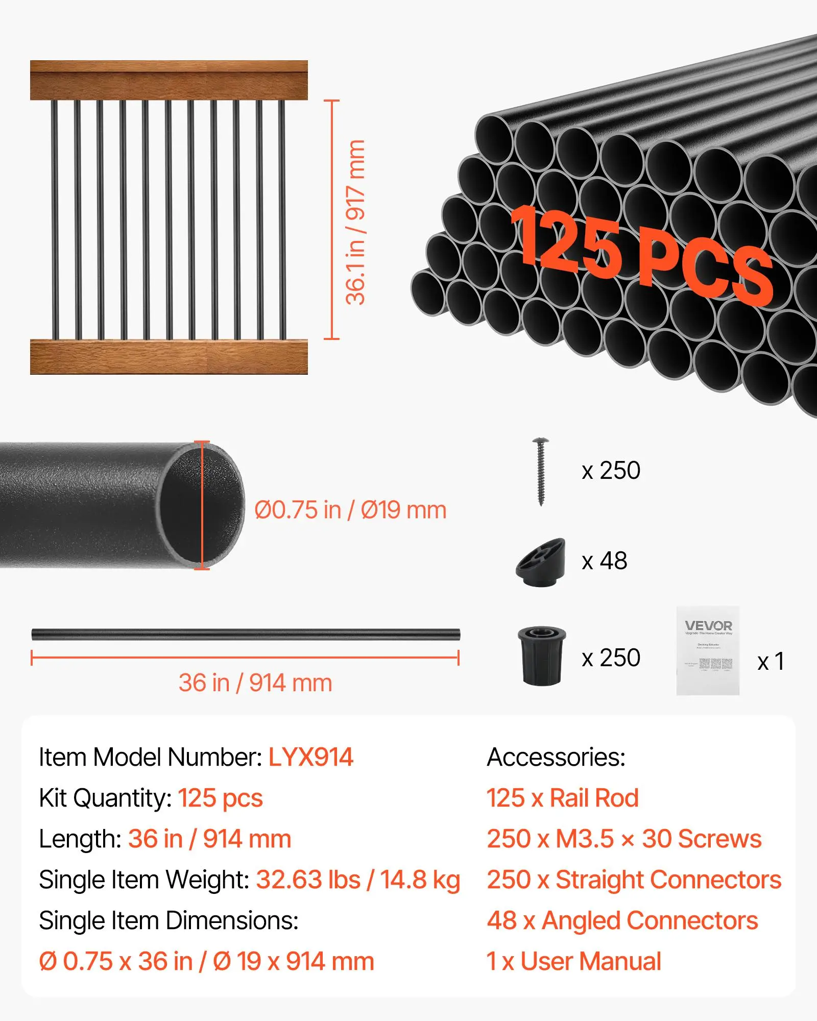 VEVOR 125 Pack Deck Balusters, 36 in Aluminum Railing Spindles, 3/4 in Diameter Hollow Round Metal Decking Stair Balusters with Connectors, Screws, for Deck, Porch & Staircase Railing Fence, Black