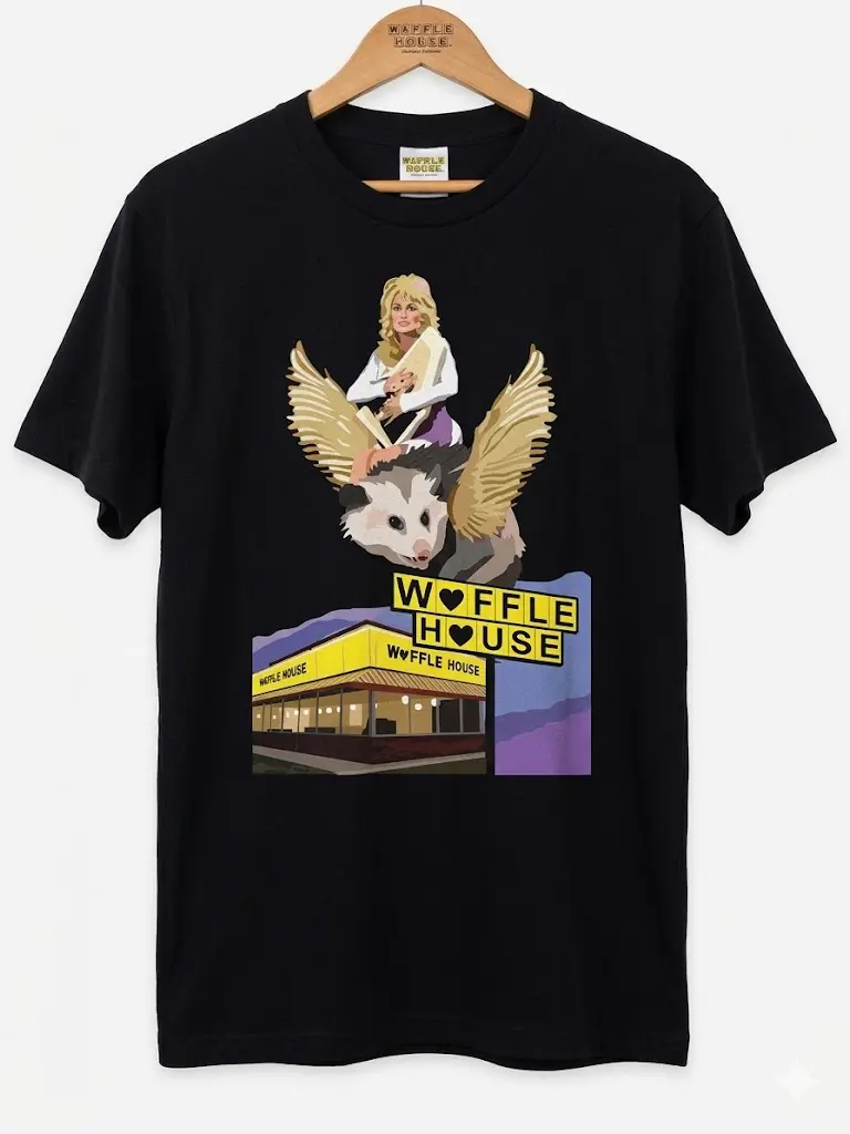 [Sale up to 30%] + [FREE SHIP] Dolly Parton Riding A Winged Possum Over Waffle-House Retro T-Shirt S-5Xl - Design & Printed in the USA Casual Classic