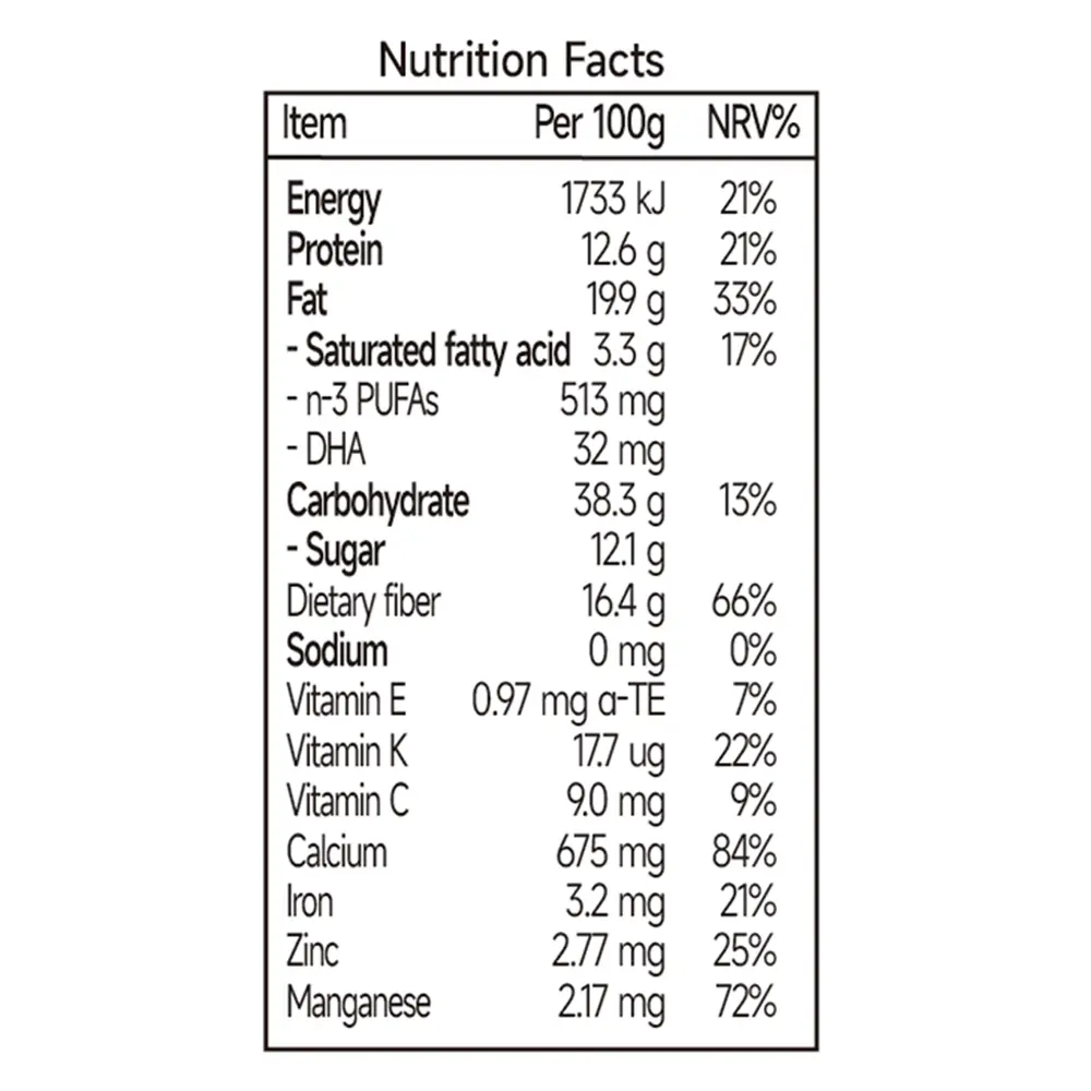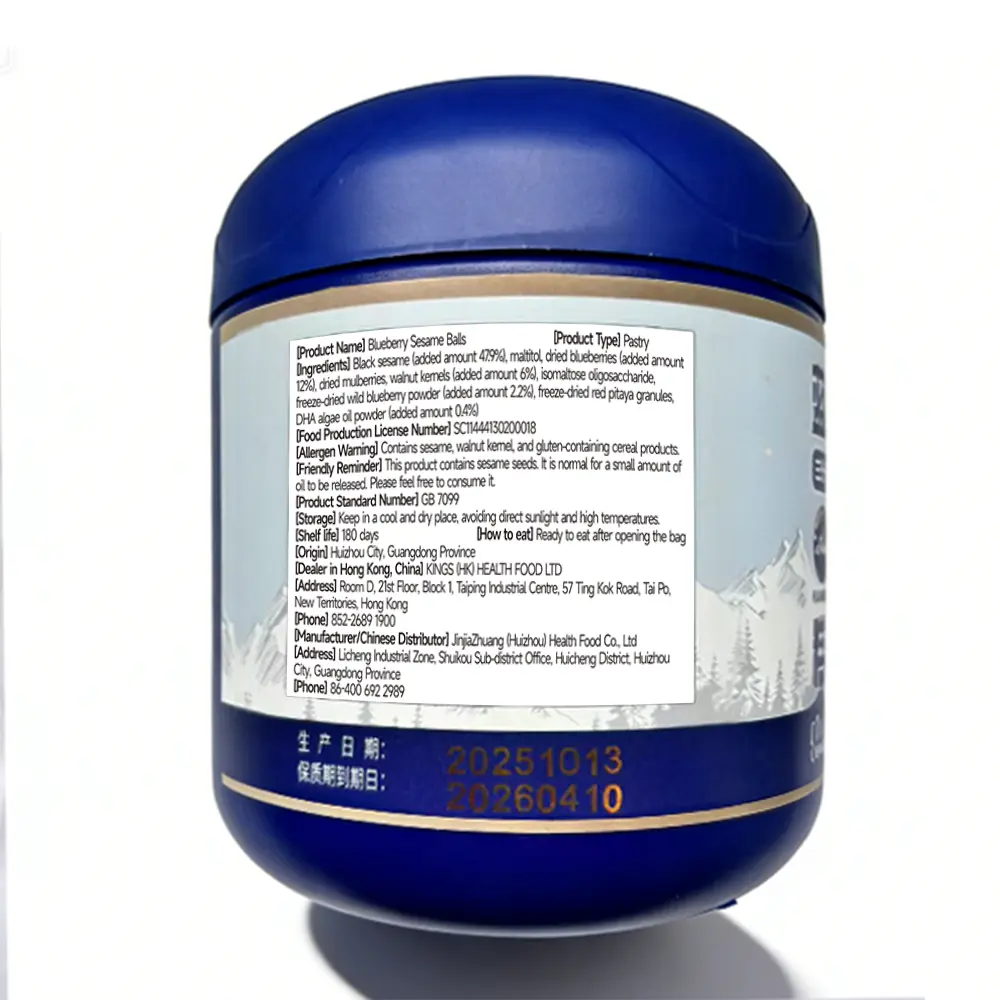 Made with six premium ingredients: cold-region blueberries, DHA algae oil powder, first-grade black sesame seeds, walnut kernels, dried mulberries, and freeze-dried red heart pitaya.Rich in anthocyanins, with a scientifically balanced blend of six key nutrients.Moderately sweet and sour, soft, glutinous and full-bodied in taste.