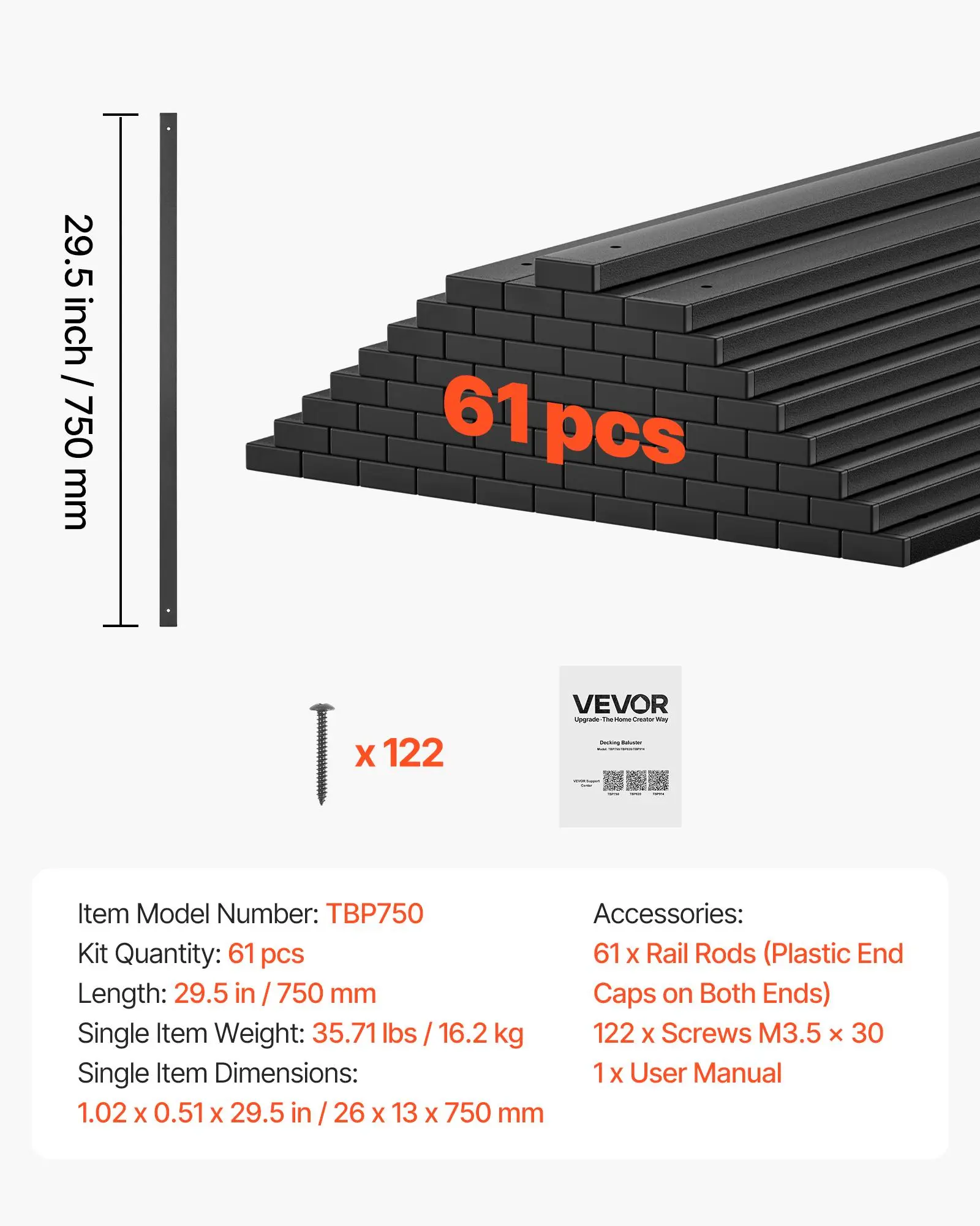VEVOR 61 Pack Deck Balusters, 29.5 in Galvanized Steel Railing Spindles, Hollow Rectangle Metal Decking Stair Balusters with Pre-Drilled Hole, End Caps, Screws, for Deck, Porch & Stair Railing, Black
