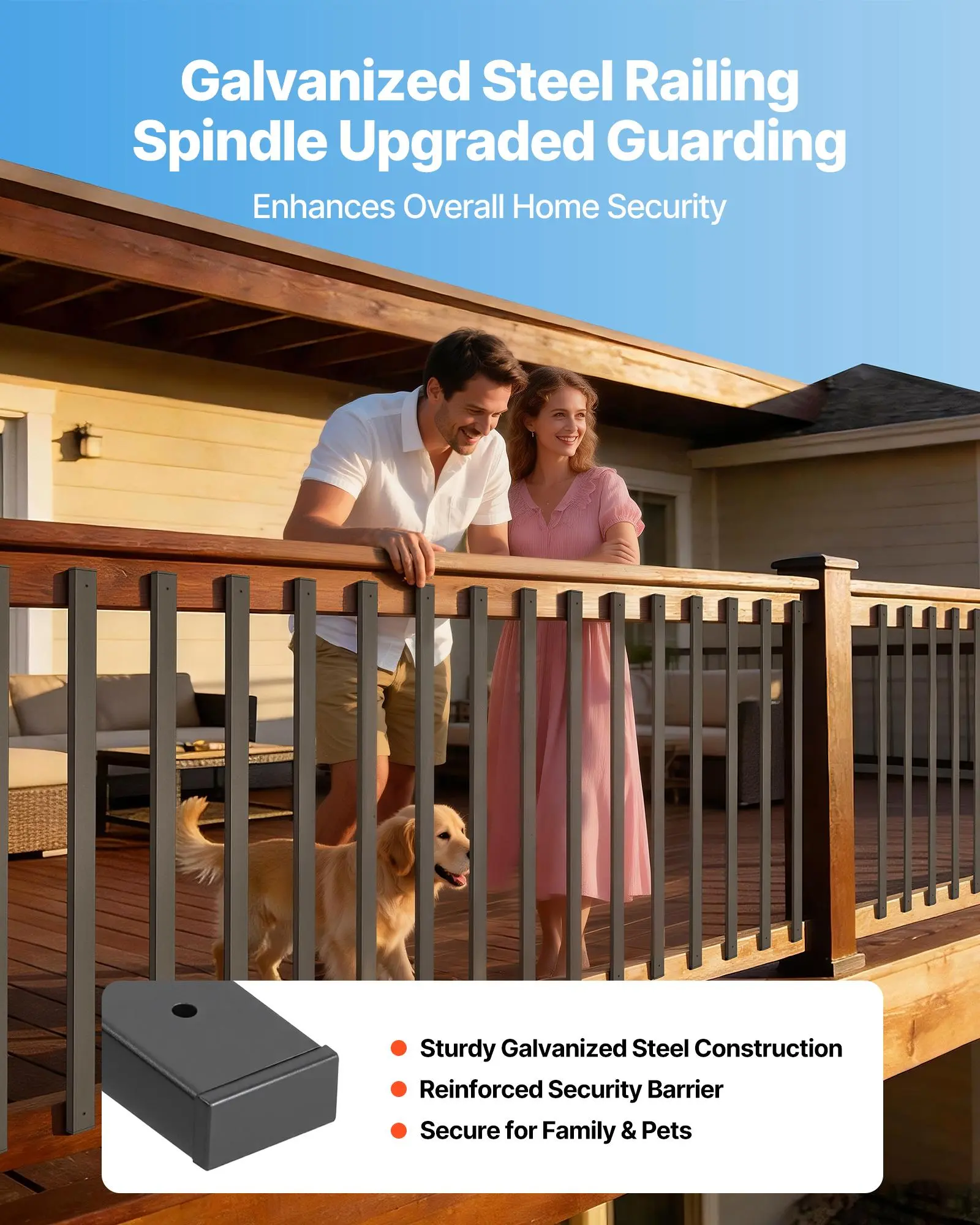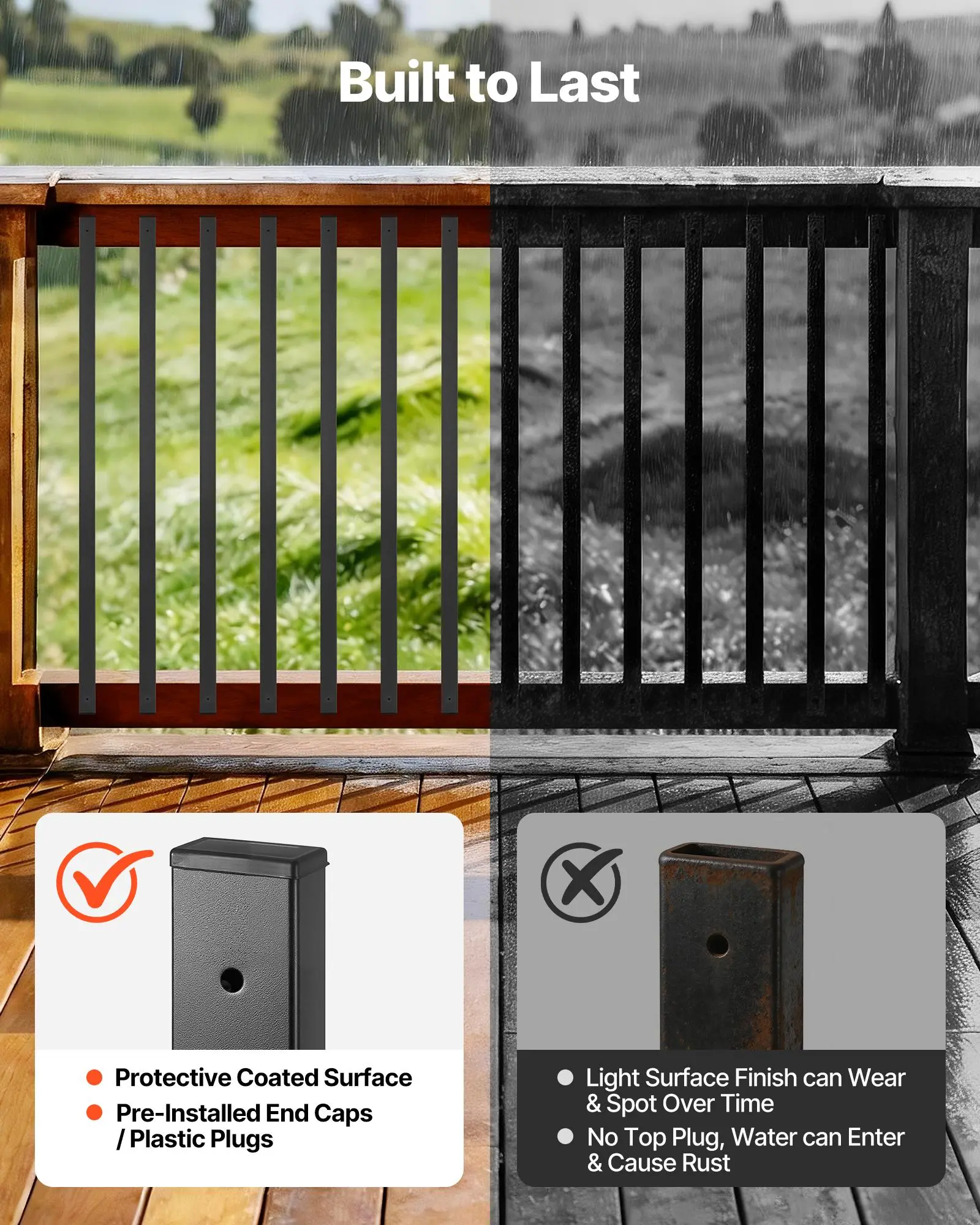 Outdoor Use: The coated galvanized steel deck railing spindles withstand sun, rain, and wet conditions, while end caps help reduce water entry for longer-lasting outdoor use