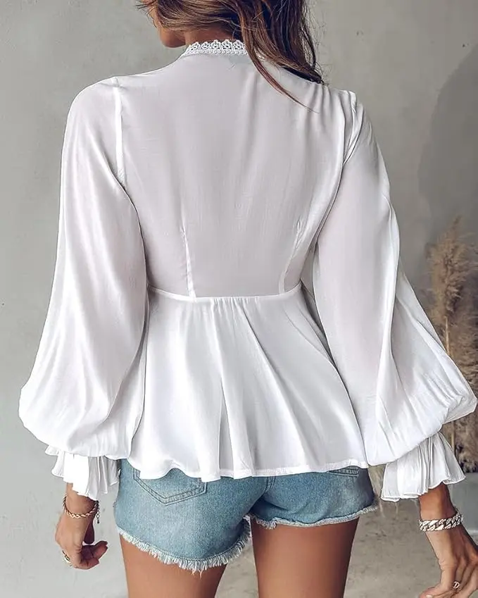 Womens Plunge Neck Sheer Lace Trim Lantern Sleeve Shirt with Tie Waist Ruffle Hem Loose Fit Casual Boho Elegant Blouse Top