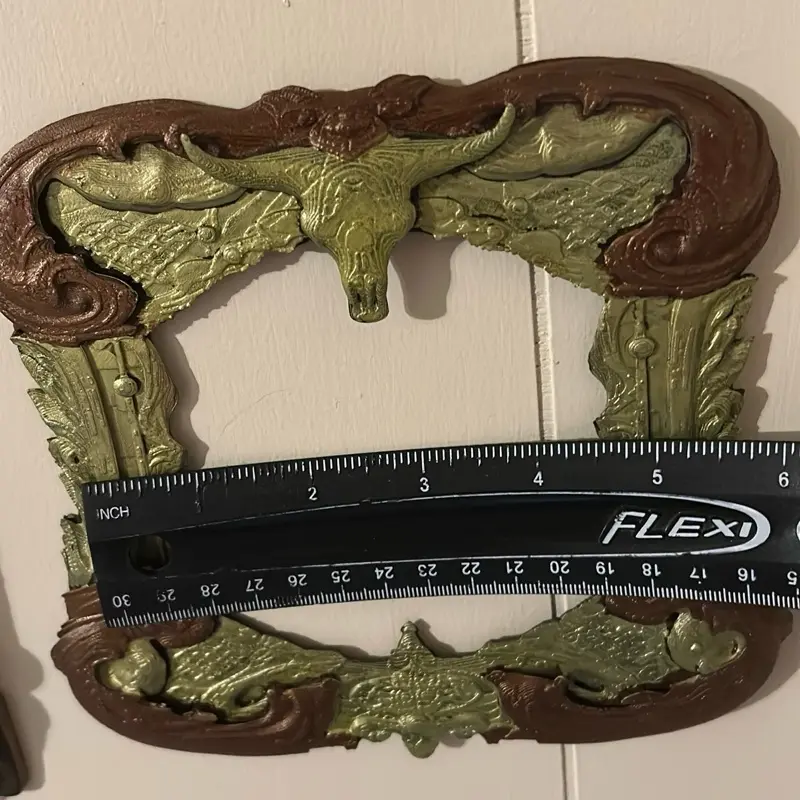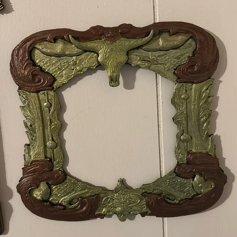 ✨ This frame embodies a rustic charm with its Longhorn Baroque design. Perfect for Western Gothic decor, it combines green and brown hues. Ideal for adding a touch of vintage elegance to any space. The frame's unique style makes it a standout piece in your home decor collection.