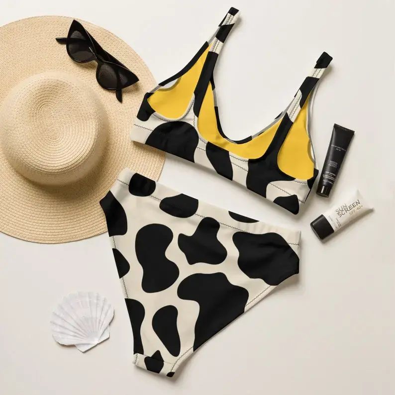 Cow Print Bikini, Recycled high-waisted bikini, Western Bikini, Cowgirl Bikini set