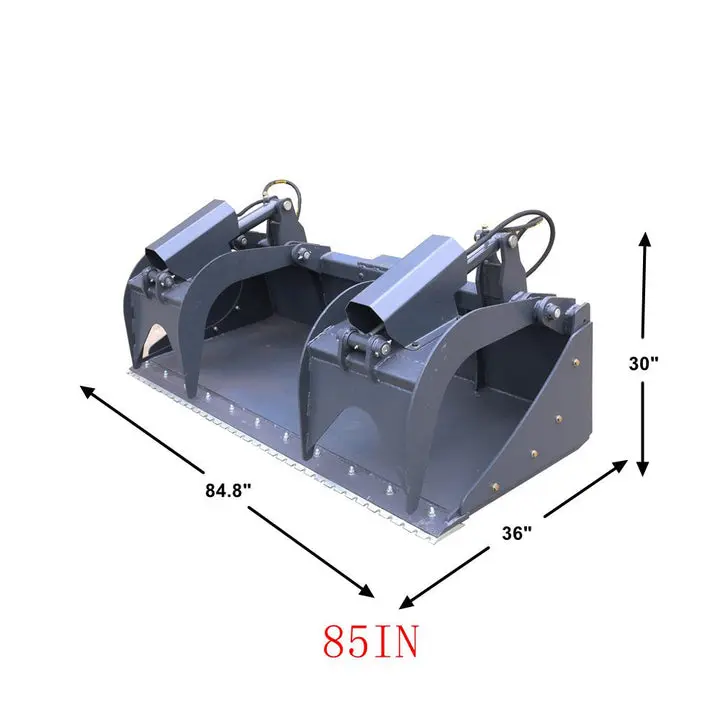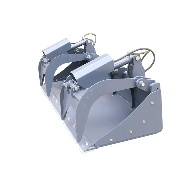 The grapple bucket attachment's basic design allows it to load and grapple large and/or uneven objects as well as clean up the smallest debris. We use 10mm reinforced body and 10mm tines with 20mm welded on cutting edge The grapple opening is 980mm. Cylinder barrel covered with optional rod covers available.