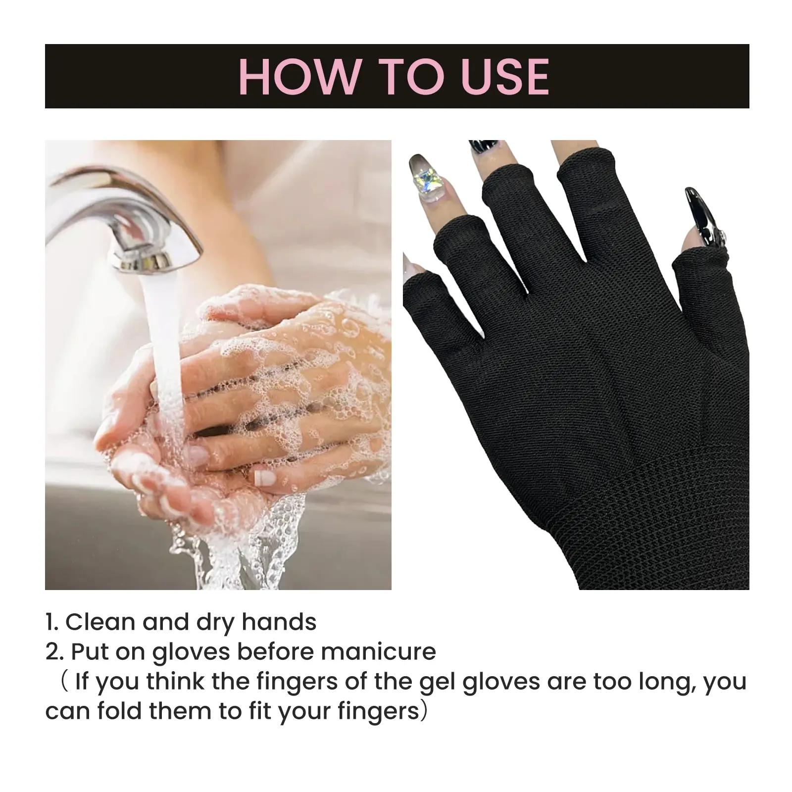 Our Anti-UV Glove contains quality fiber. It can blocking ultraviolet rays, protect hands from high-power ultraviolet nail lights and strong outdoor light, prevent dullness, dryness, roughness, and aging of hand skin, enjoy nail art with peace of mind. Its use is very simple: Clean and dry hands. Put on gloves before manicure (lf you think the fingers of the gel gloves are too long, you can fold them to fit your fingers). Provides ultra-soft touch and unparalleled comfort, lightness, breathability, elasticity, and quick-drying, more finger skin is protected.