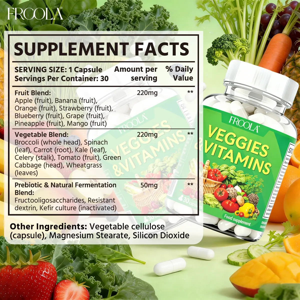FRCOLA Veggies & Vitamins Capsules is your daily all-in-one nutritional supplement, perfect for busy lifestyles. Each serving delivers 220mg fruit blend (apple, banana, orange, etc.) and 220mg vegetable blend (broccoli, spinach, kale, etc.), plus 50mg prebiotic & fermentation blend to support gut health.