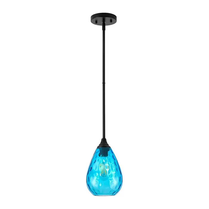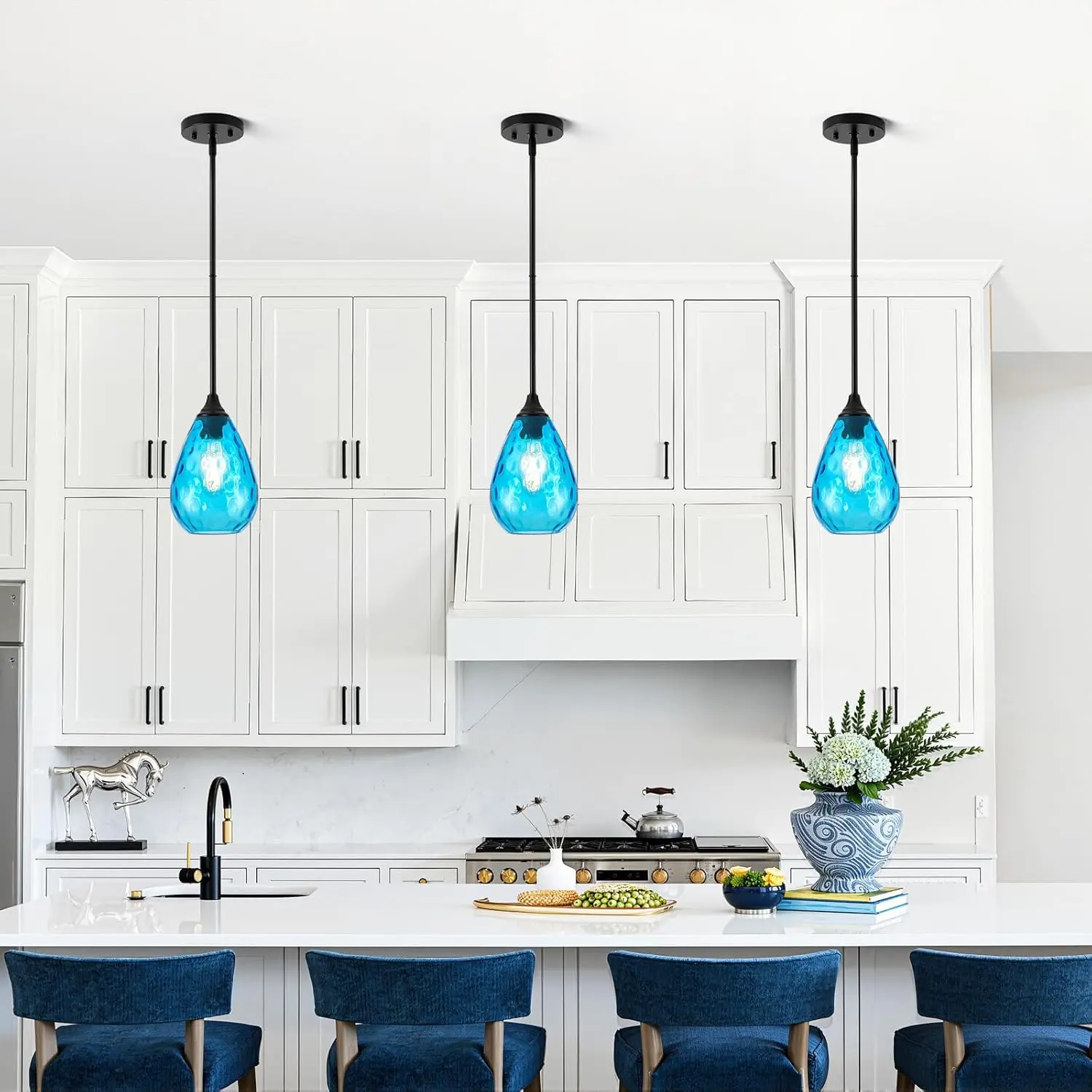Glass Pendant Lights Kitchen Island, 1-Light Modern Black Fixtures with Blue Hammered Glass & Rods Small Hanging Light for Kitchen Sink Dining Room Bathroom