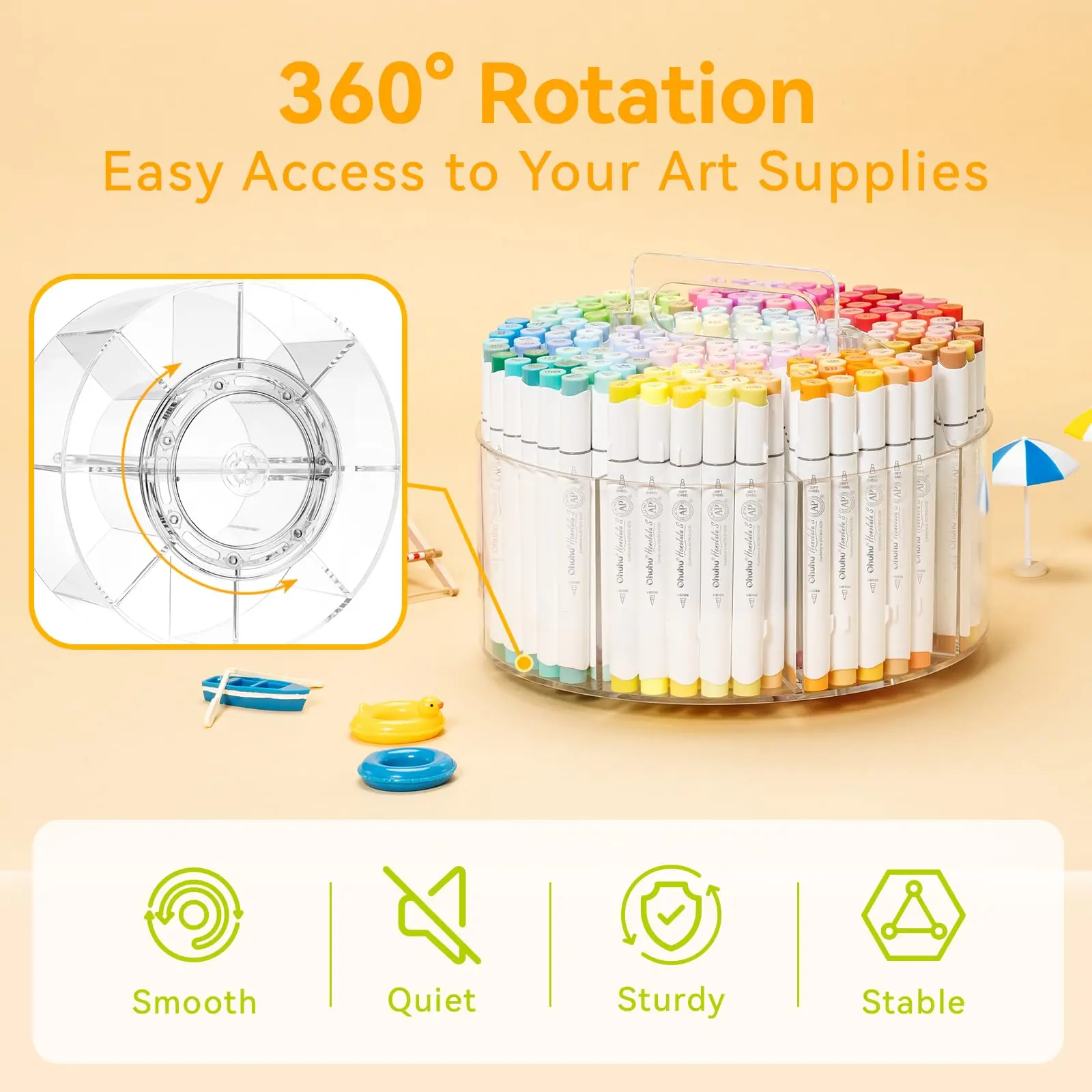 ·360° Smooth Rotation, Low-Noise Access - Designed with a smooth 360° rotating base, this organizer lets you quickly turn and access the section you need, making it easy to find the right marker in seconds. The professionally engineered track rotates quietly and smoothly, so you can stay focused without distracting noise during your creative process.
