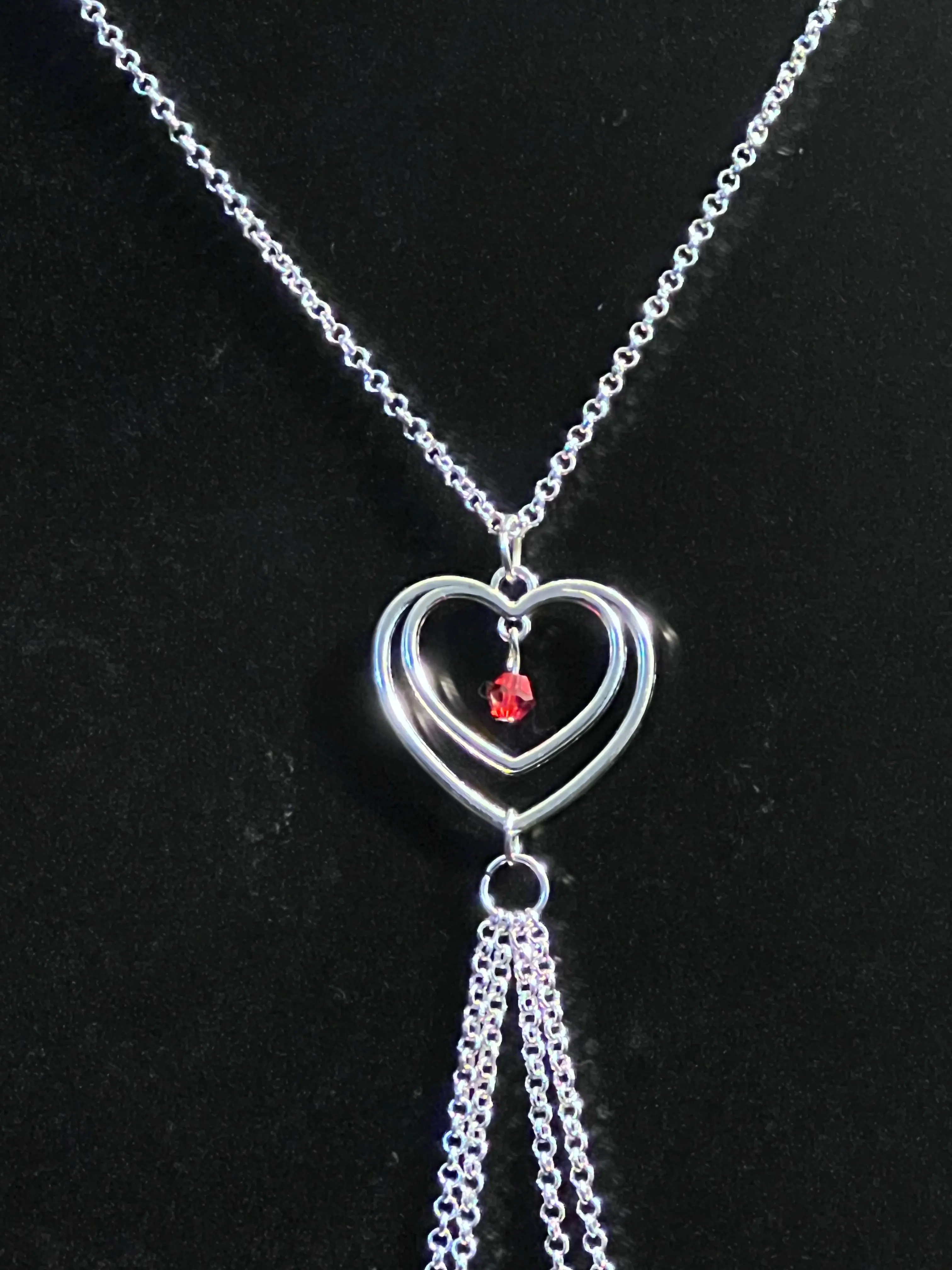 Add a touch of shine with this handmade double‑heart non‑piercing nipple necklace, crafted for comfort, sparkle, and a customizable fit. The silver stainless‑steel hearts frame a suspended red crystal accent, creating a soft, eye‑catching glow that complements a wide range of styling looks.