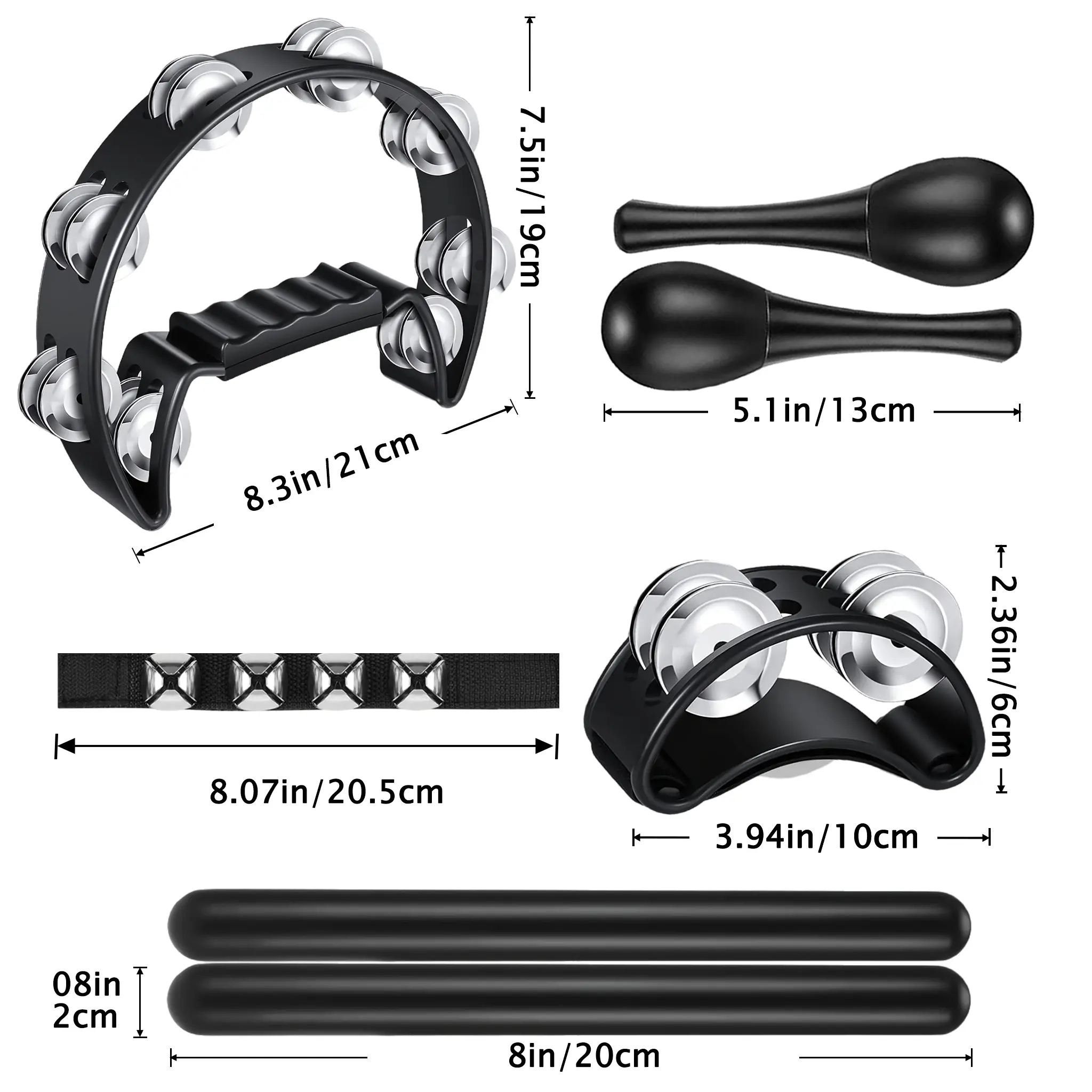 11 Pcs Tambourine Percussion Set: Includes half moon tambourine, foot tambourine, wrist bells, rhythm sticks and maracas. They produce clear, crisp sounds, ideal for church, parties, bands and family use.