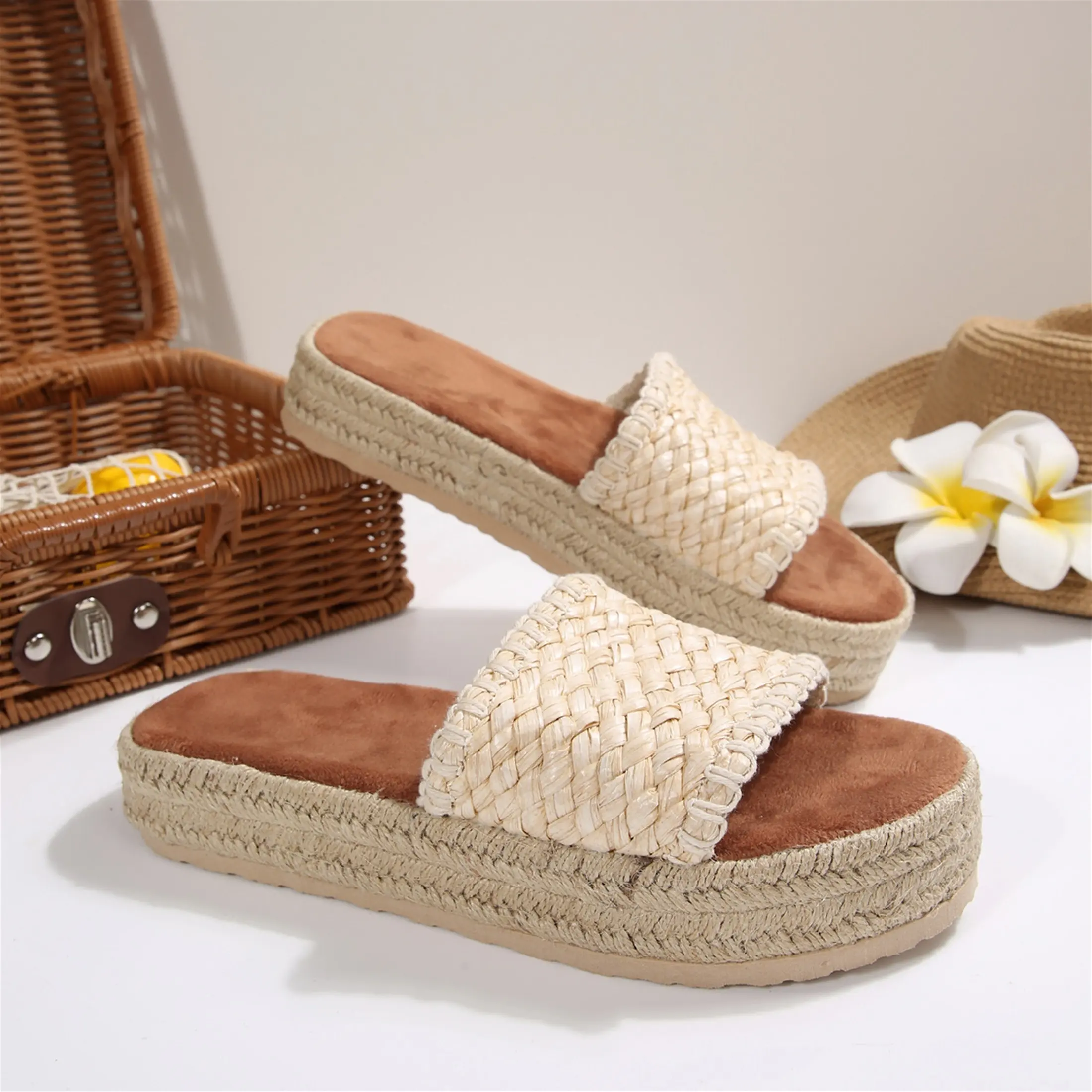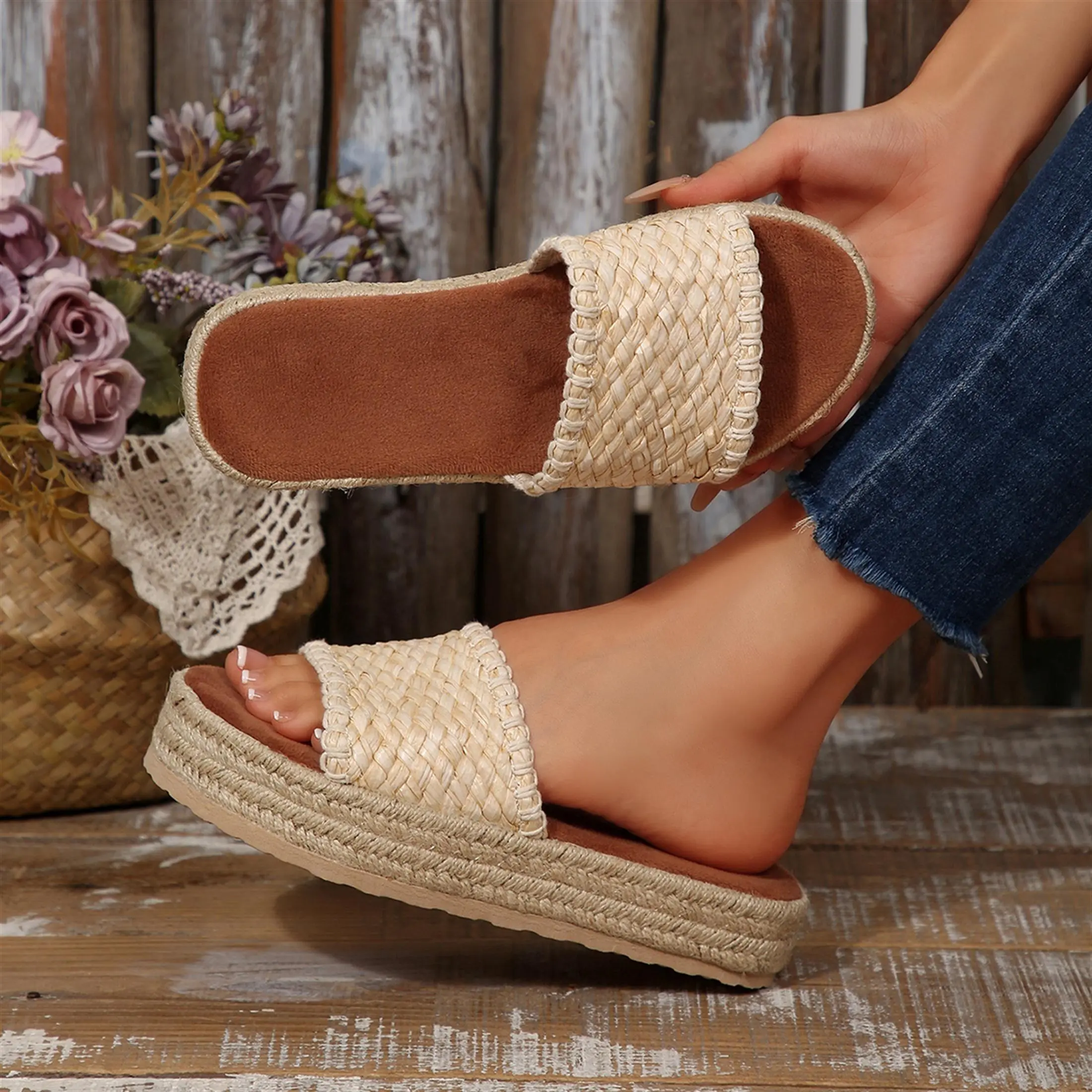 Women's Thick Sole Woven Slide Sandals Open Toe Bohemian Espadrille Shoes