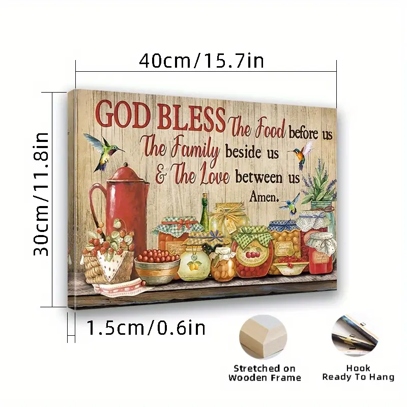 Framed Canvas Wall Art - God Bless the Food Family & Love Inspirational Print with Hummingbirds, Rustic Kitchen Decor for Dining Room, Home Office, Living Room - Classic Art Deco Framed Canvas Artwork, Large Canvas Wall Art, Office Artwork,