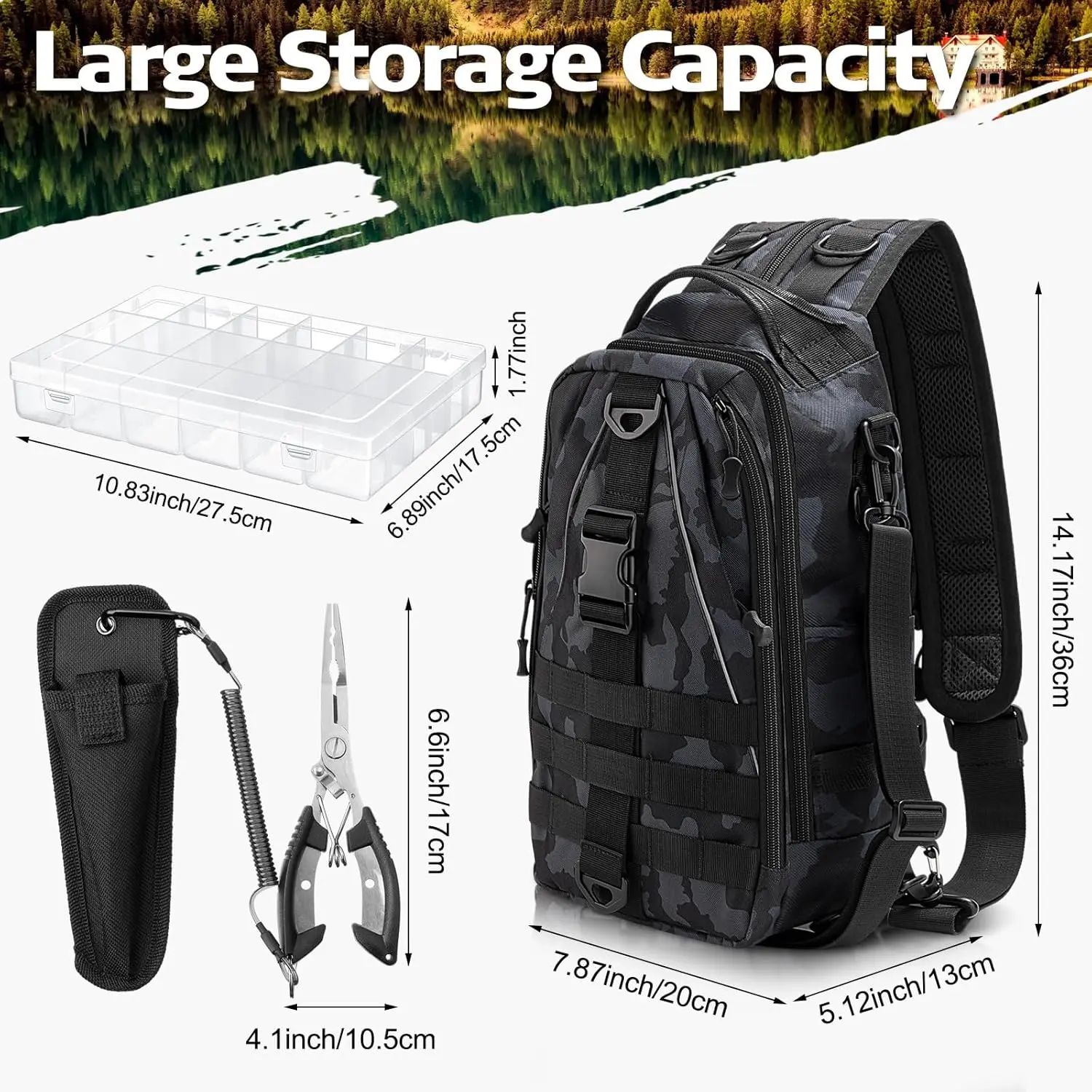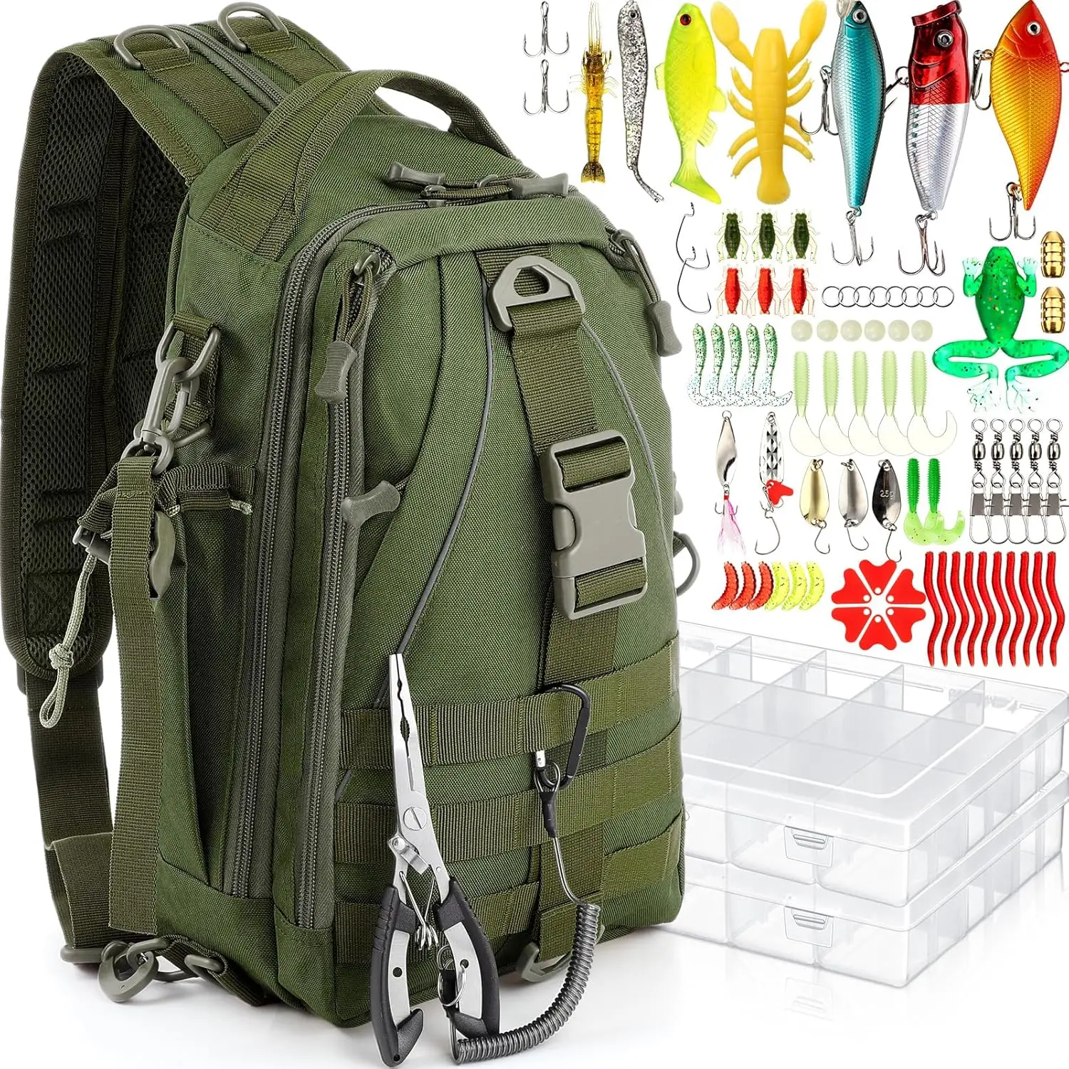 Fishing Backpack with Tackle Boxes, Tackle Sling Bag with Rod Holder, Fish Lures Kit and Pliers Set, Easter Fishing Gift Basket for Men Women