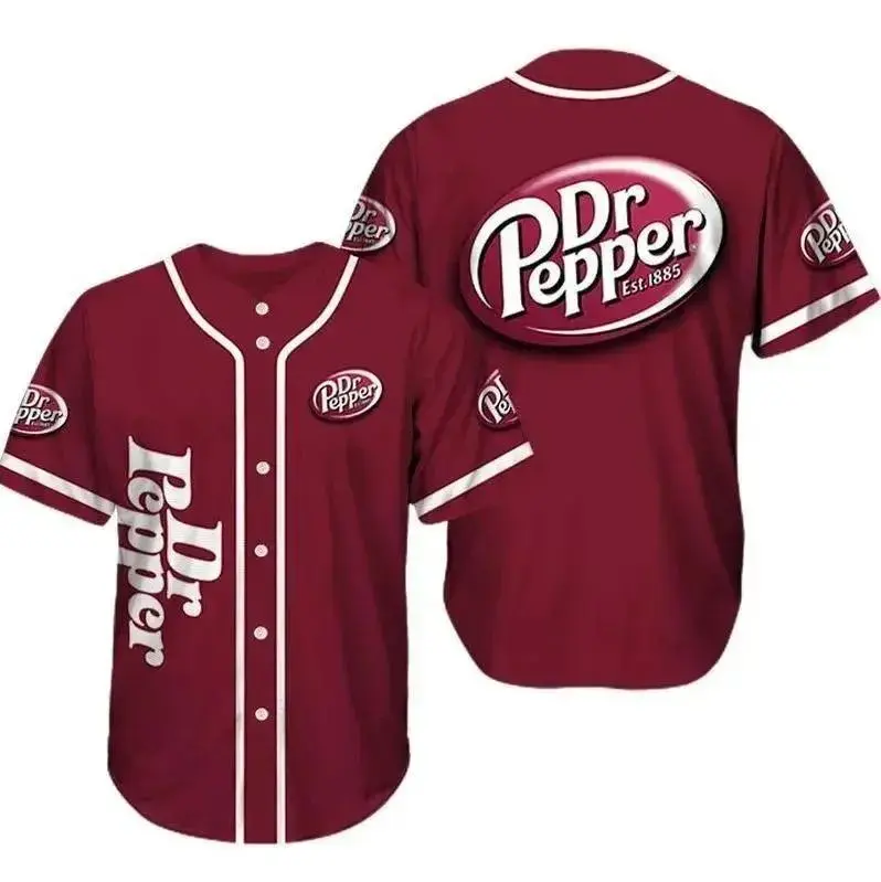 5. Dr Pepper Baseball Jersey – Trendy Back Graphic Button Up Shirt, Retro Soda Style Lightweight Streetwear Outfit