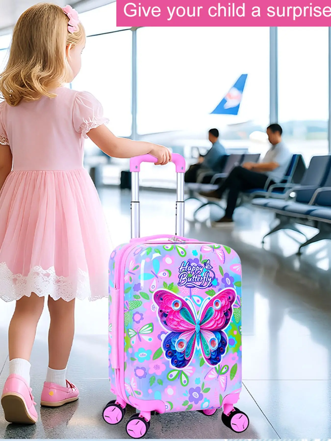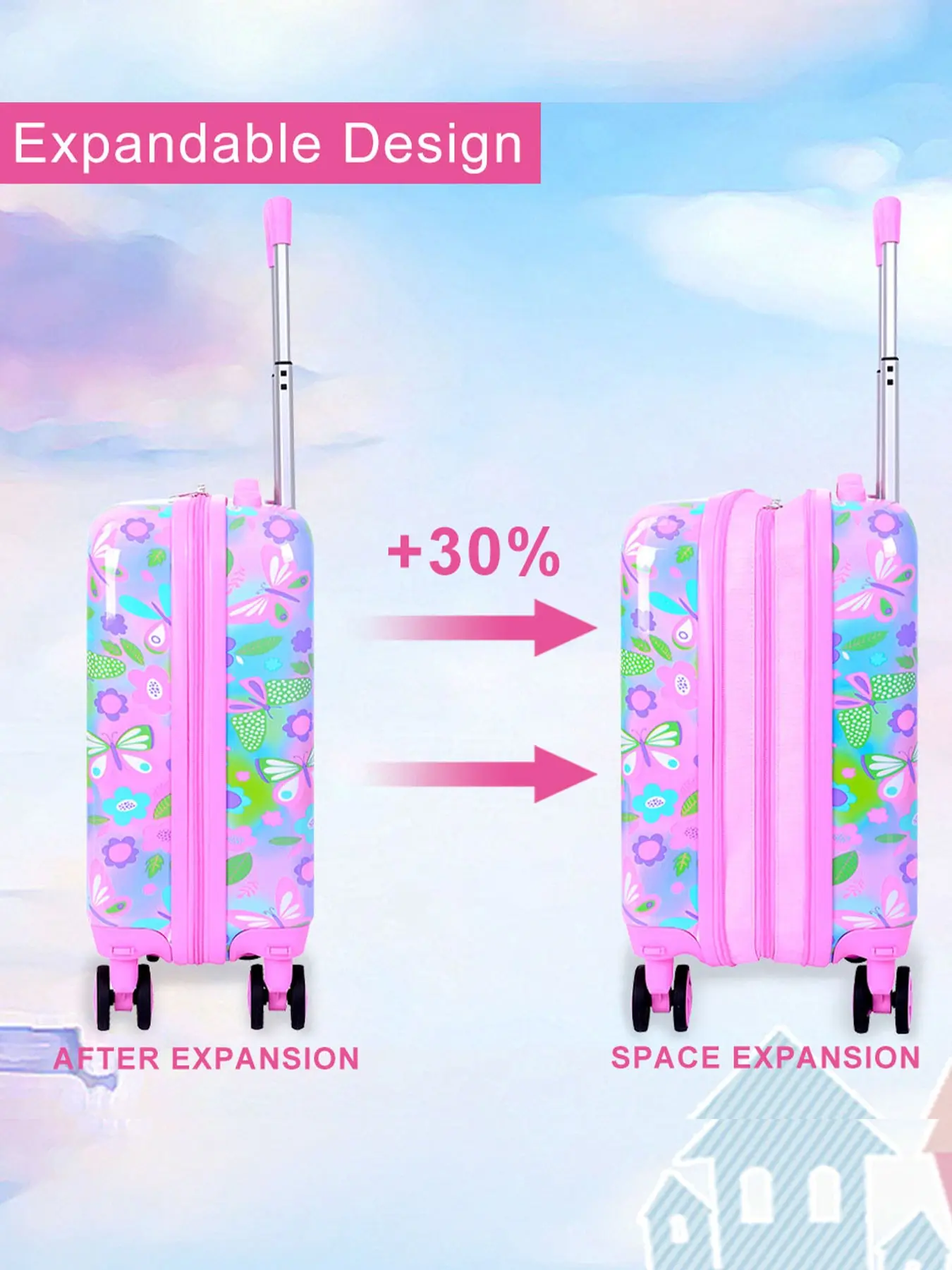 1 Set Kids Luggage Set, Cute Butterfly Print Hard Shell Suitcase with U-Shaped Neck Pillow, Lightweight Rolling Carry On Luggage for Girls, Travel Suitcase for School Trip, Vacation, Airplane
