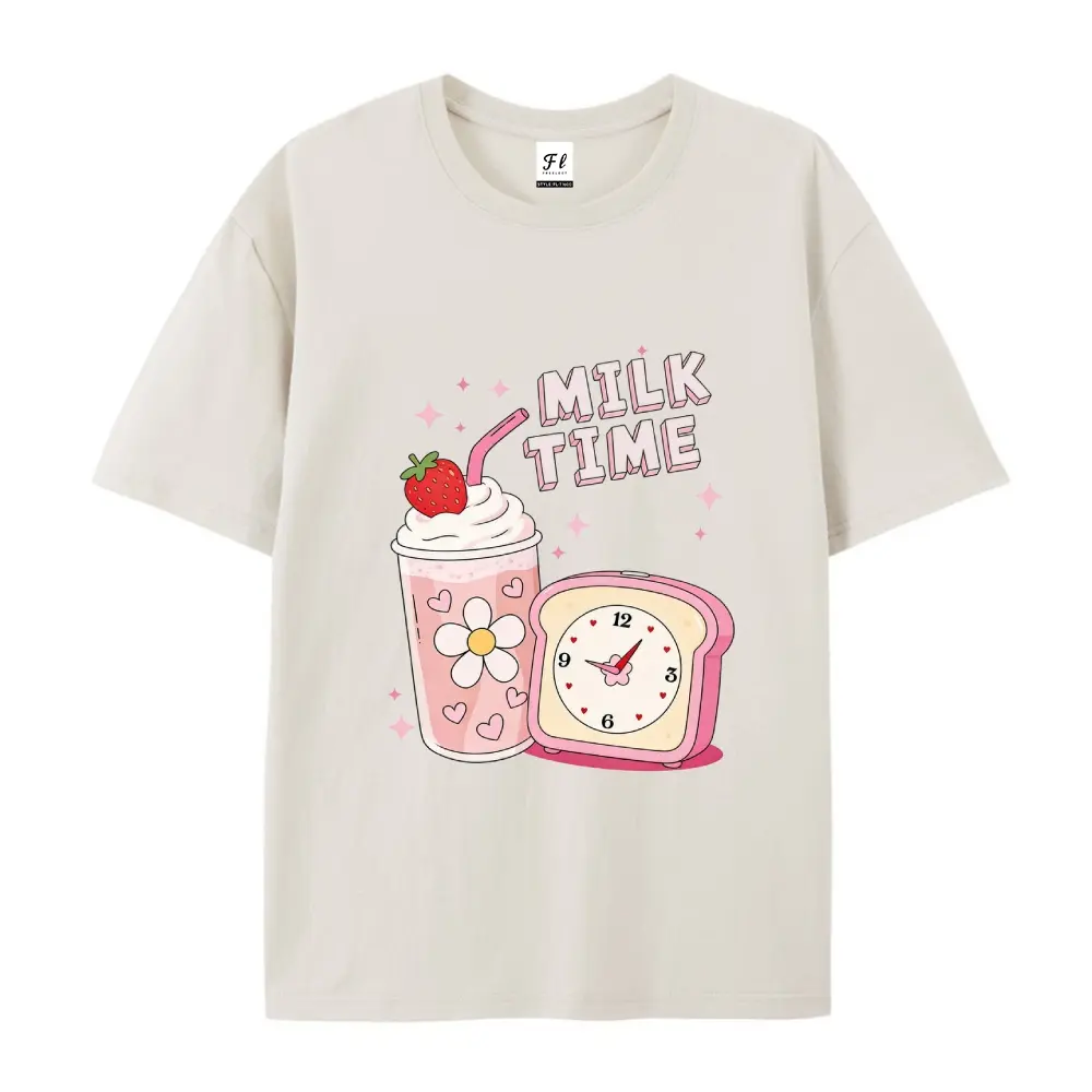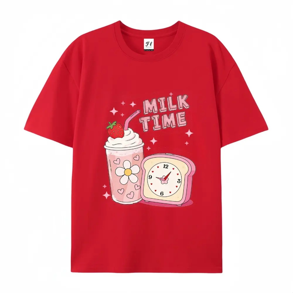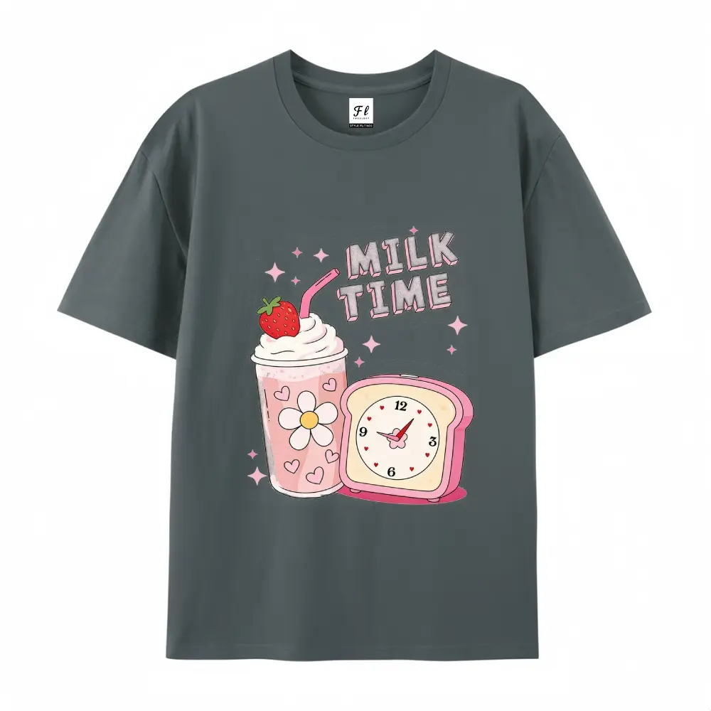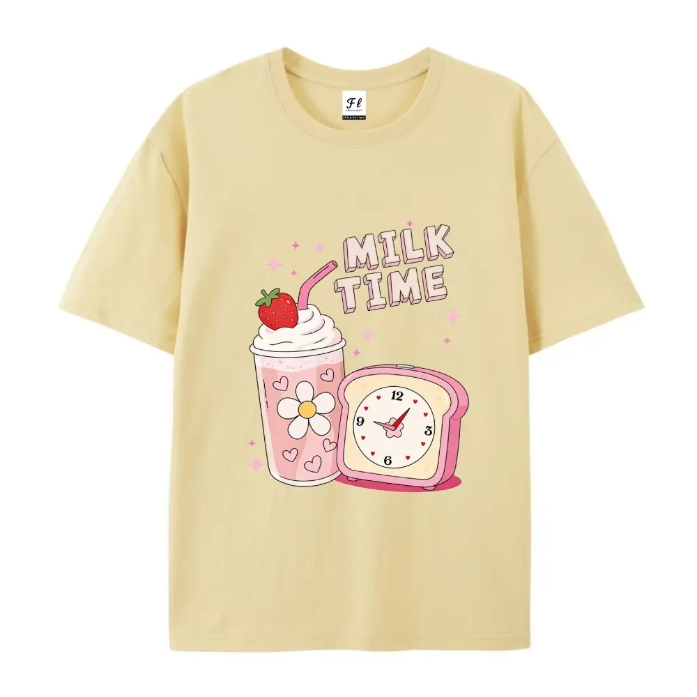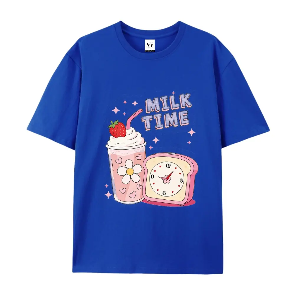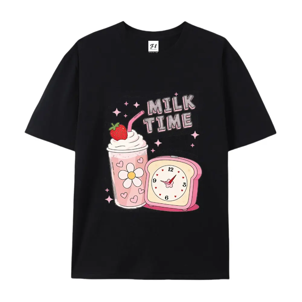 ·Design Elements: The shirt includes a strawberry milkshake and a retro clock. The "MILK TIME" text is prominently displayed. No additional features are mentioned. 📸