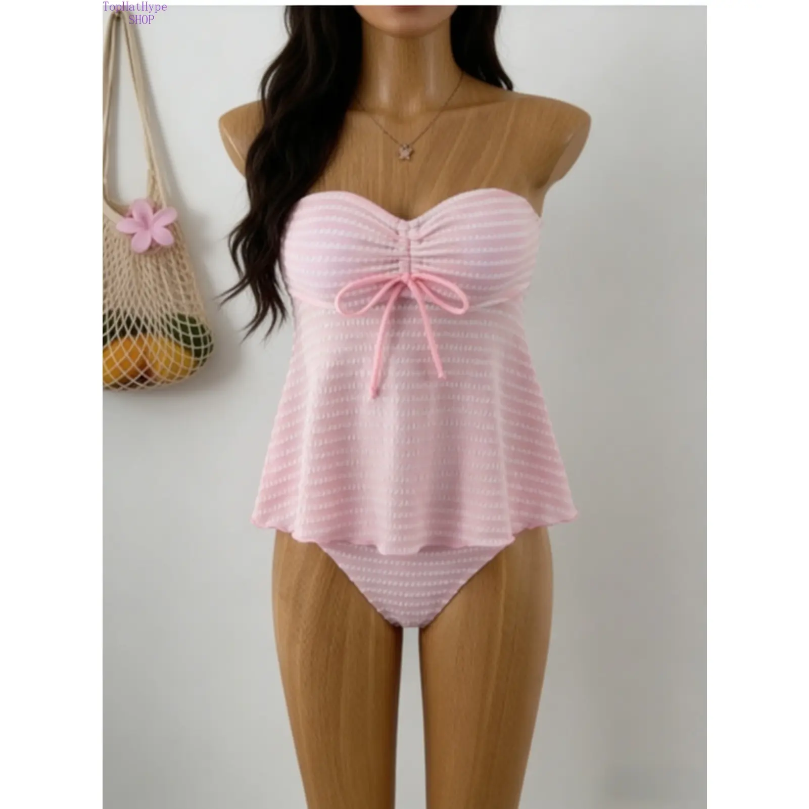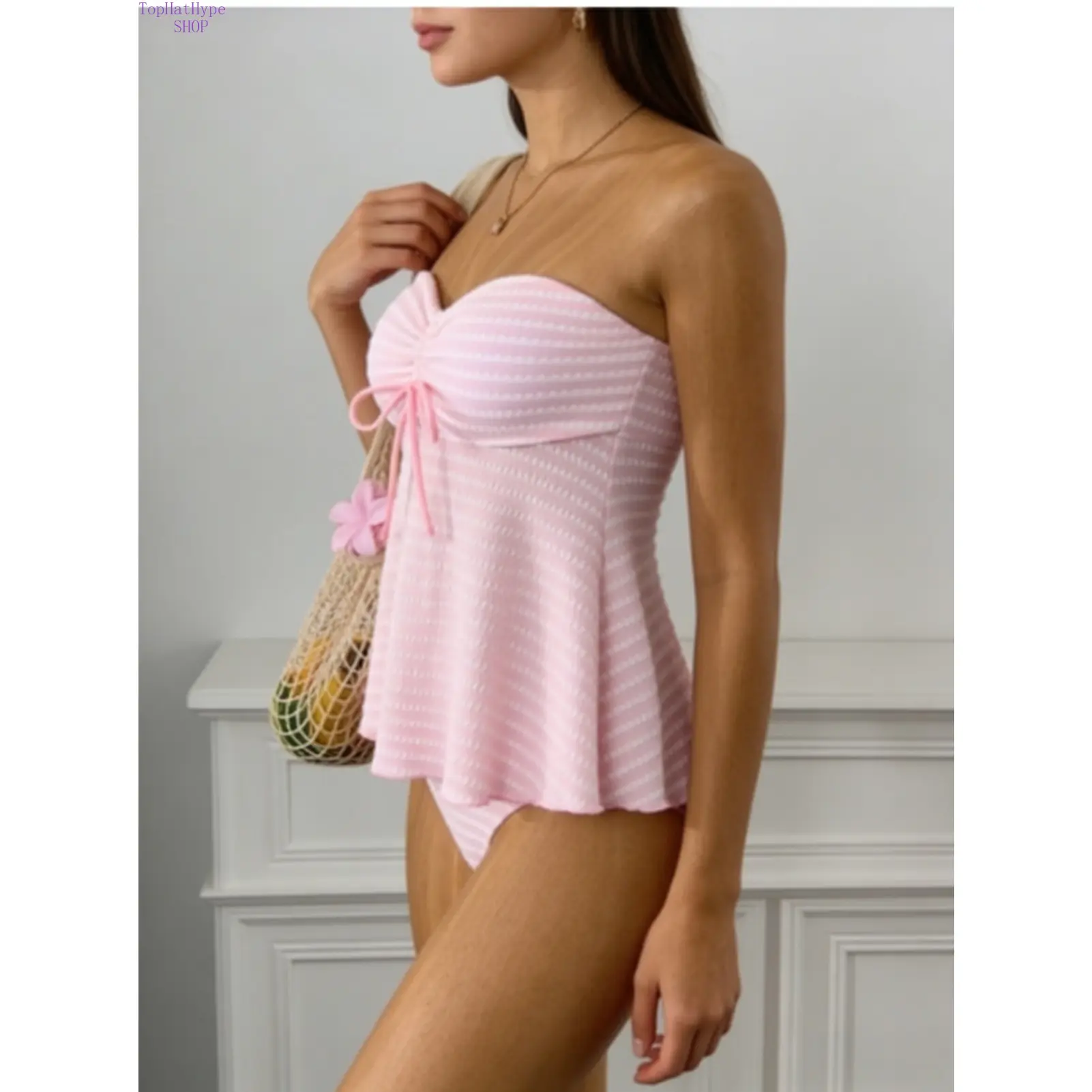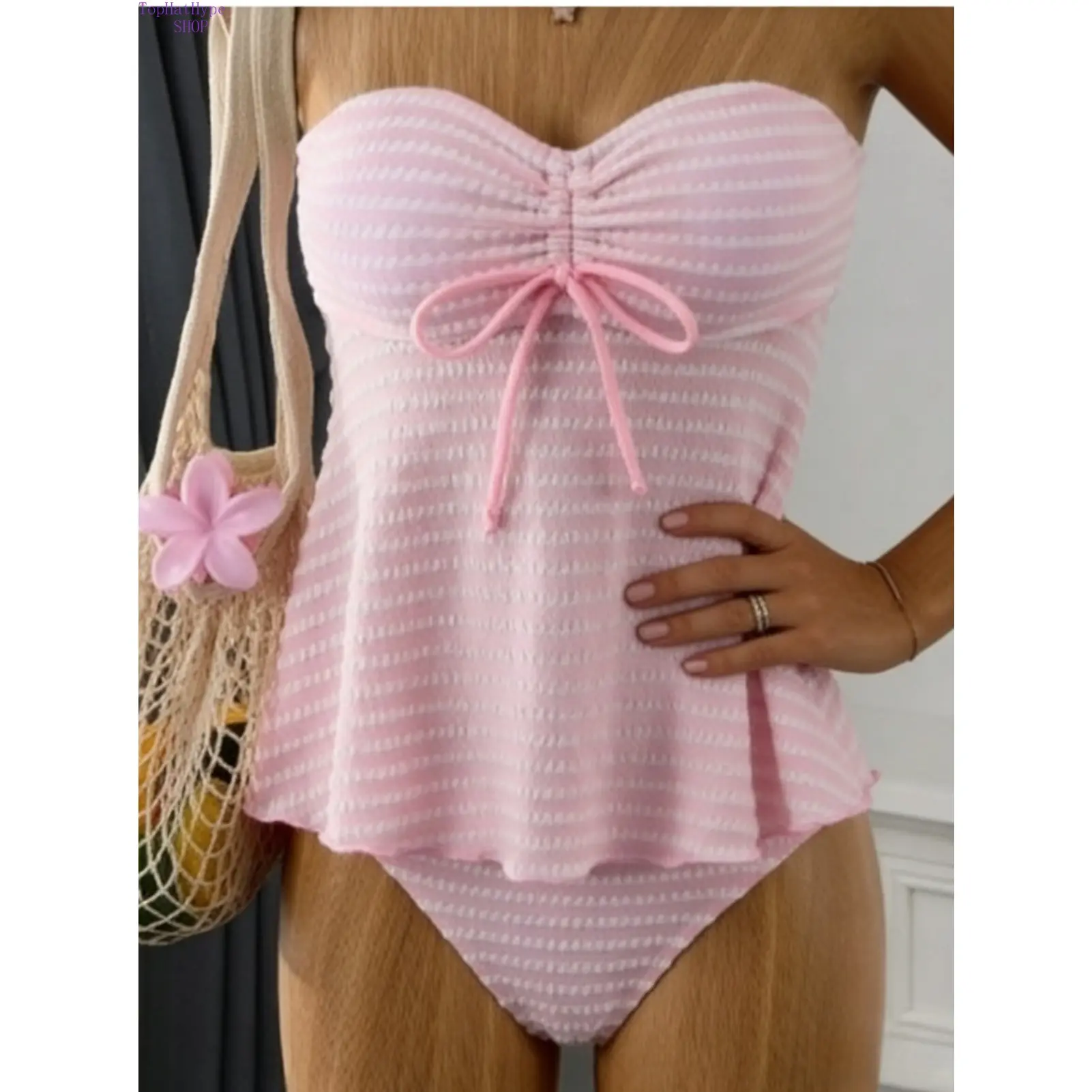 Strapless Pink Striped Tankini Set Women Textured Ruffled Bandeau Swimsuit | Ruched Flowy Bathing Suit for Summer Beach Vacation Pool Party