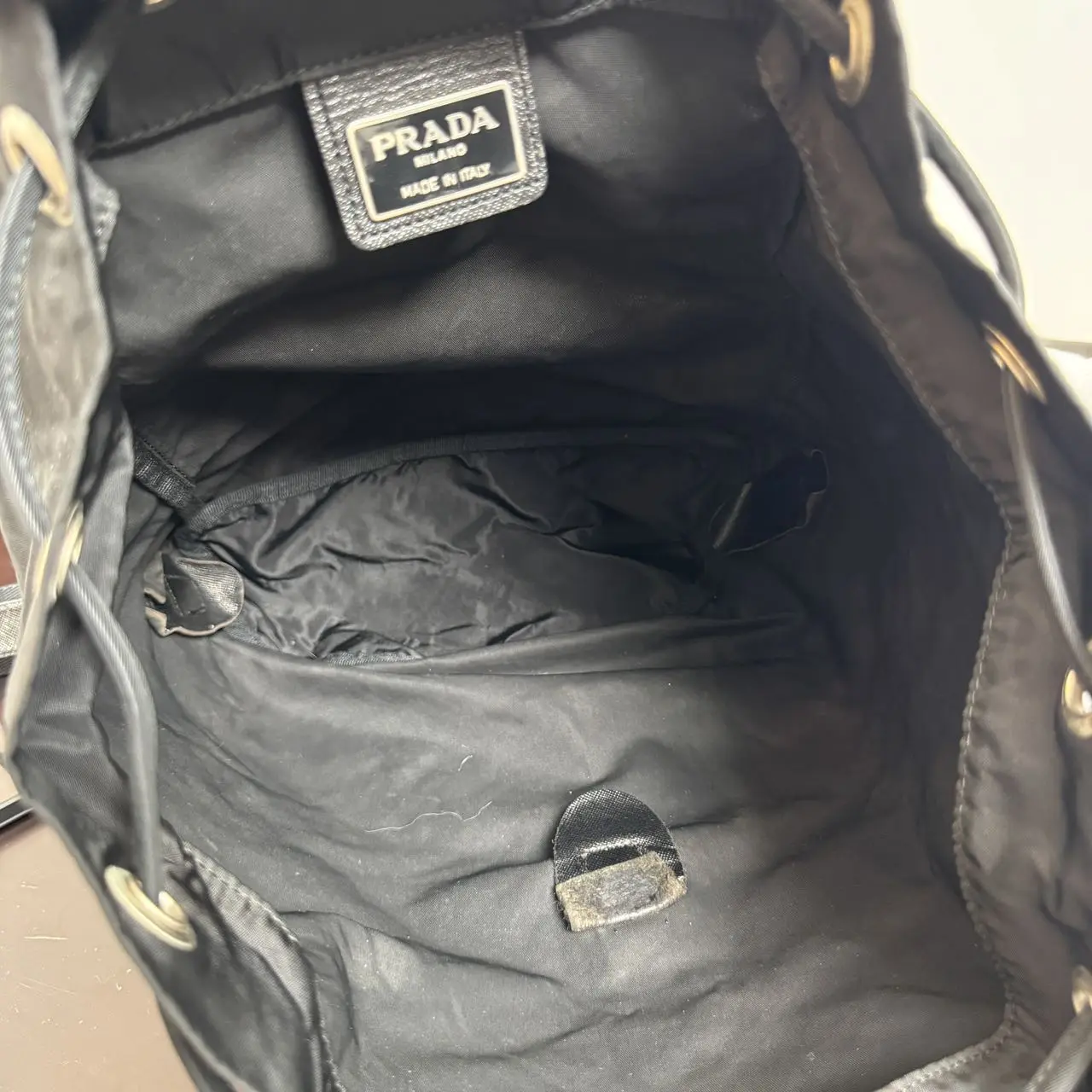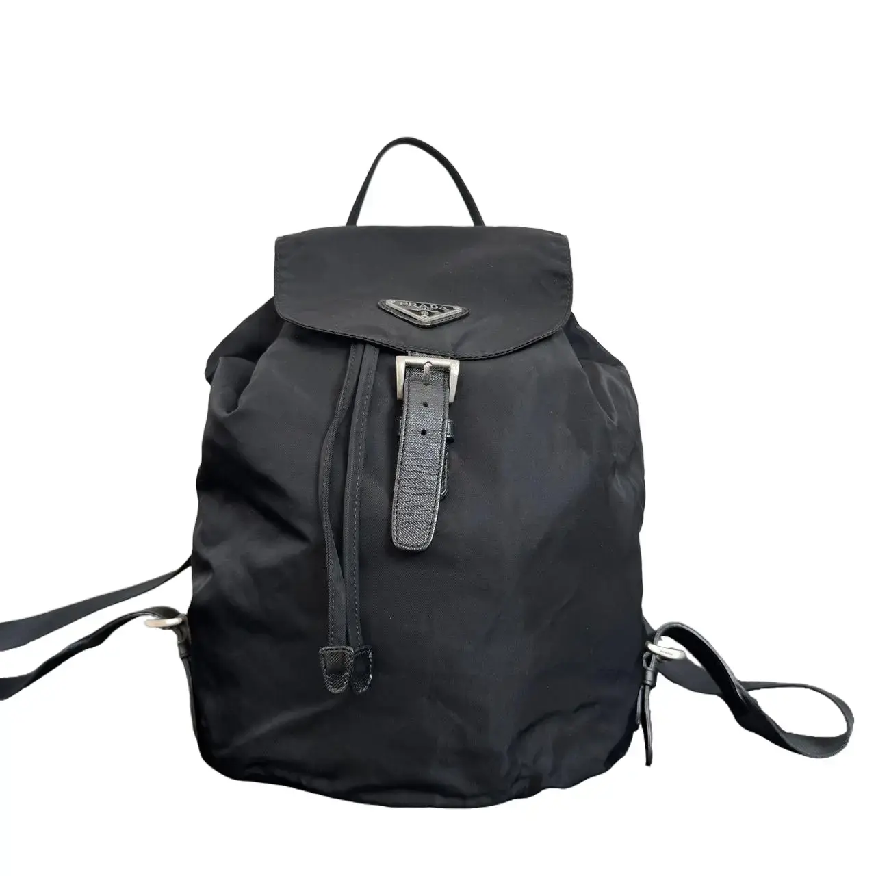 Pre-owned PRADA nylon Backpacks Authentic Vintage Black Drawstring Backpack with Triangle Logo Lightweight & Durable for Daily Use Classic Drawstring Closure & Adjustable Straps