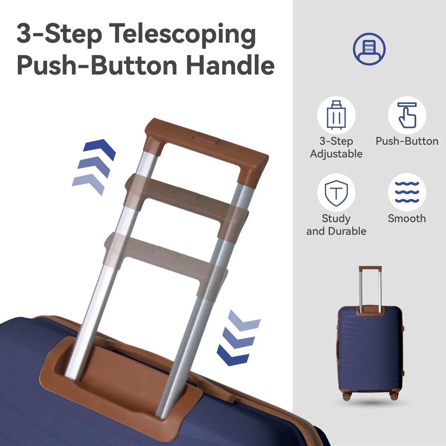 1. "Nested Design": " This 3-piece luggage set features a nested design, including a 20\" carry-on and 24\" & 28\" checked bags, crafted from durable 100% PP material to suit all your travel needs."