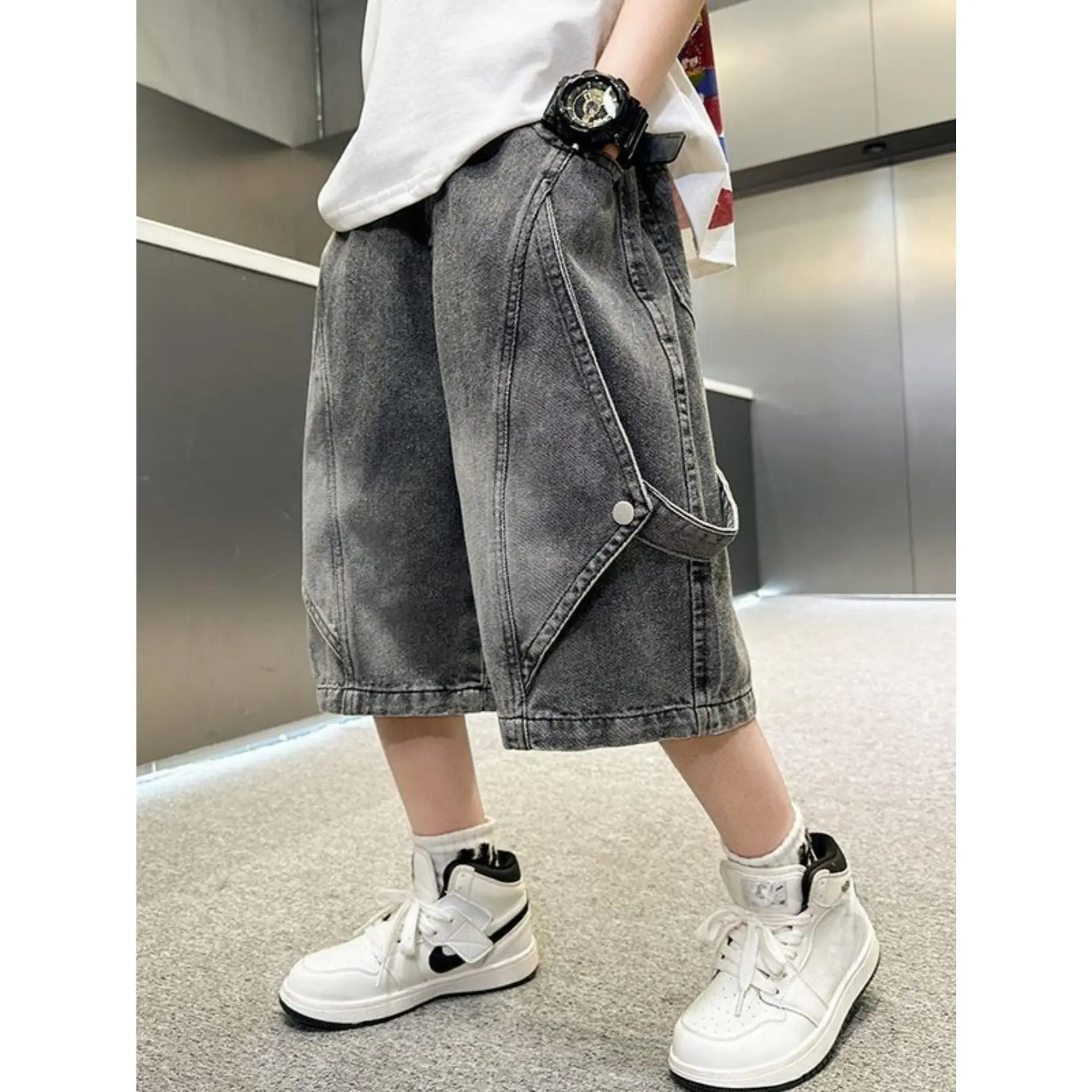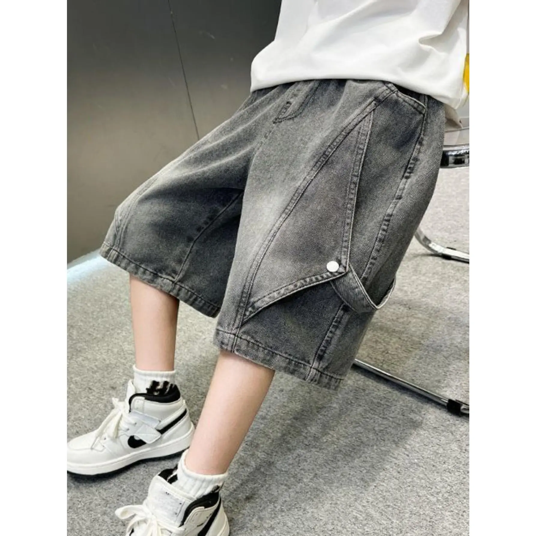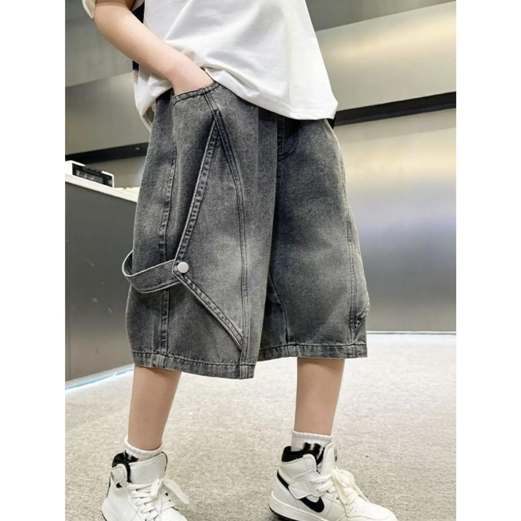 NewStylish Denim Shorts for Boys, Featuring a Retro Wide-Leg Design with Large Pockets And an Elastic High Waist, Perfect for Summer. These Loose-Fitting