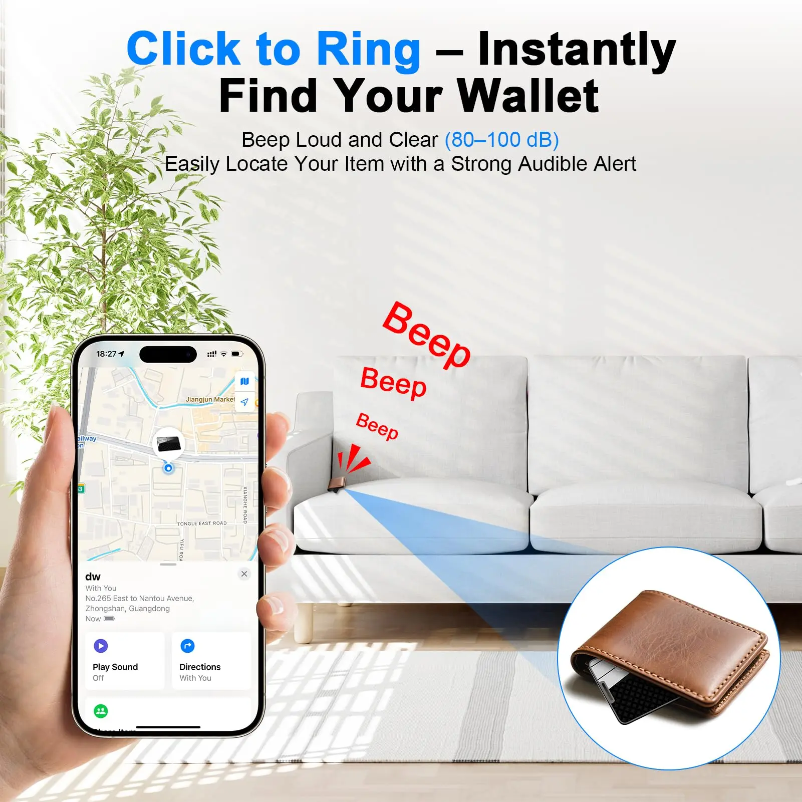 Super Loud Sound: Open the (Find My) app on your iPhone and tap (Play Sound). When within Bluetooth range, the wallet tracker emits a 100 dB beep—loud enough to hear even under a thick blanket