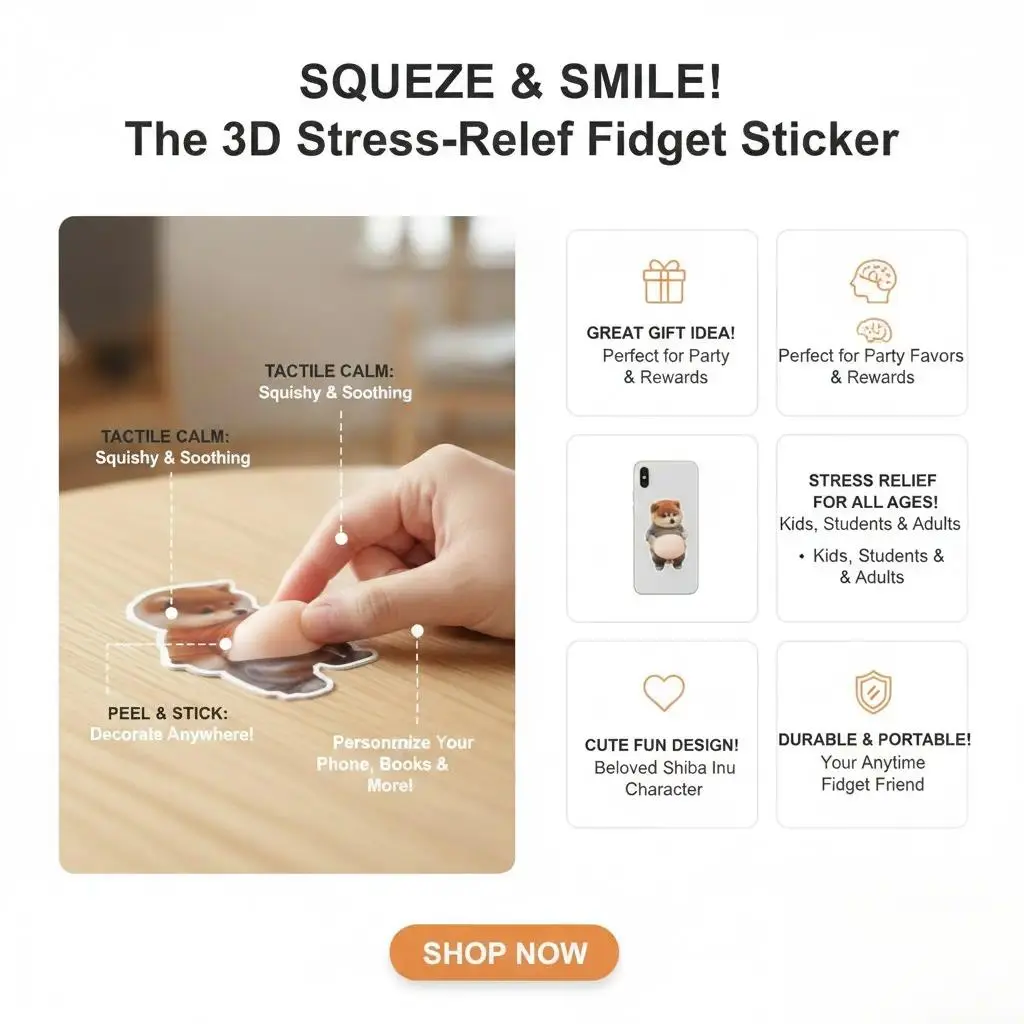 About this item Includes 6 pcs of squeezable stickers:Two squeezable puppy stickers, two squeezable kitten stickers, and two squeezable puppy stickers of another style Squeeze and release the pressure with this lovely pinch toy.fidgety squeeze and release the pressure with this lovely fidgety toy Wonderful gift,sweet warm friend family and yourself materials make from materials,providing a comforting tactiles Shiba inu stickers selfs adhesive,you can use it decorates you phone, scrapbook notebook and so on decompressions toy Perfect fidgety toy for and adults,offering hours of entertainment Ideal Party Favor Choice: fun addition to birthday bags, classroom rewards, holiday , or craft activity stations Soft Interactive Decals: playful effect sensory enjoyment while decorating planners, cases, notebooks, or crafts Perfect for Kids and Adults: great , teens, and adults who enjoy creative expression and personalized accessories Cute 3D Dog Stickers: fun squeeze-belly designs add texture and personality to phones, laptops, scrapbooks, and journals for all ages Easy Peel and Stick: simple adhesive backing allows quick placement on smooth surfaces like phone cases, computers, or planners Cute 3D Stickers Funny Design Featuring a squeezable design, these 3D stickers boast a soft texture that supports emotion-boosting play and delivers a fun sensory experience perfect for sparking creativity in art or play activities Convenient to Carry These 3D stickers for kids are crafted to be portable and easy to carry, making them ideal for outdoor fun. Their compact size ensures they can be effortlessly stored in bags or pockets, while their lightweight nature adds no burden Specifications Material: PVC Product size: about 11x7cm/4.33x2.76 inches Weight: about 30g Decorative stickers featuring playful dog designs with a squeeze belly theme are perfect for adding a touch of fun to various items. These decorative stickers can be used as party favors or to individualize phone cases, making them ideal for kids, girls, teens, and even adults. Their creative appeal extends to scrapbooks, planners, and journals, allowing users to enhance their crafting projects effortlessly. Specification 3D stickers*1 Note: Due to different lighting and screen settings, the item color may be slightly different from the picture. Due to different manual measurements, please allow a 1-2cm difference in size.