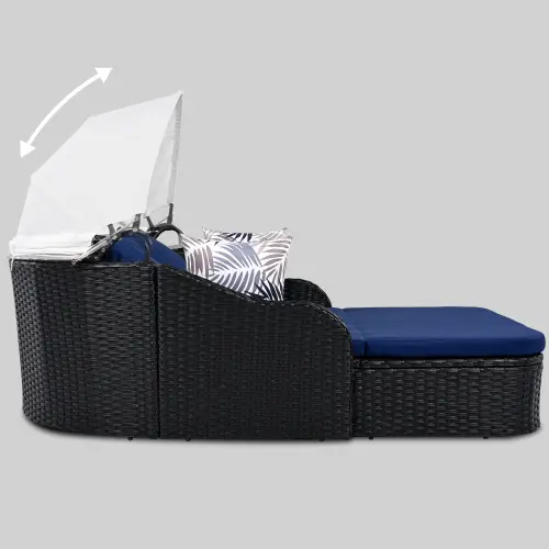 ·It's crafted with high-quality PE rattan materials ensuring longevity, perfect for your outdoor relaxation. All cushions and pillows are zippered for easy cleaning. Measuring 79.9 inches in length and 52.4 inches in width it can comfortably accommodate two adults. The adjustable canopy on the lounger shields you from sunlight, allowing for the ultimate relaxation experience. The half-package stylish curved armrests provide support where needed while still exhibiting elegance. Featuring a comfortable backrest and an sloped angle, you can easily recline while enjoying the outdoors. Don't worry about bringing extra pillows as the lounger includes two large gray pillows and two colorful decorative pillows. Adjustable feet for uneven ground make you comfortable in any place. Enjoy the best of the outdoors time with this Outdoor Sun Bed!