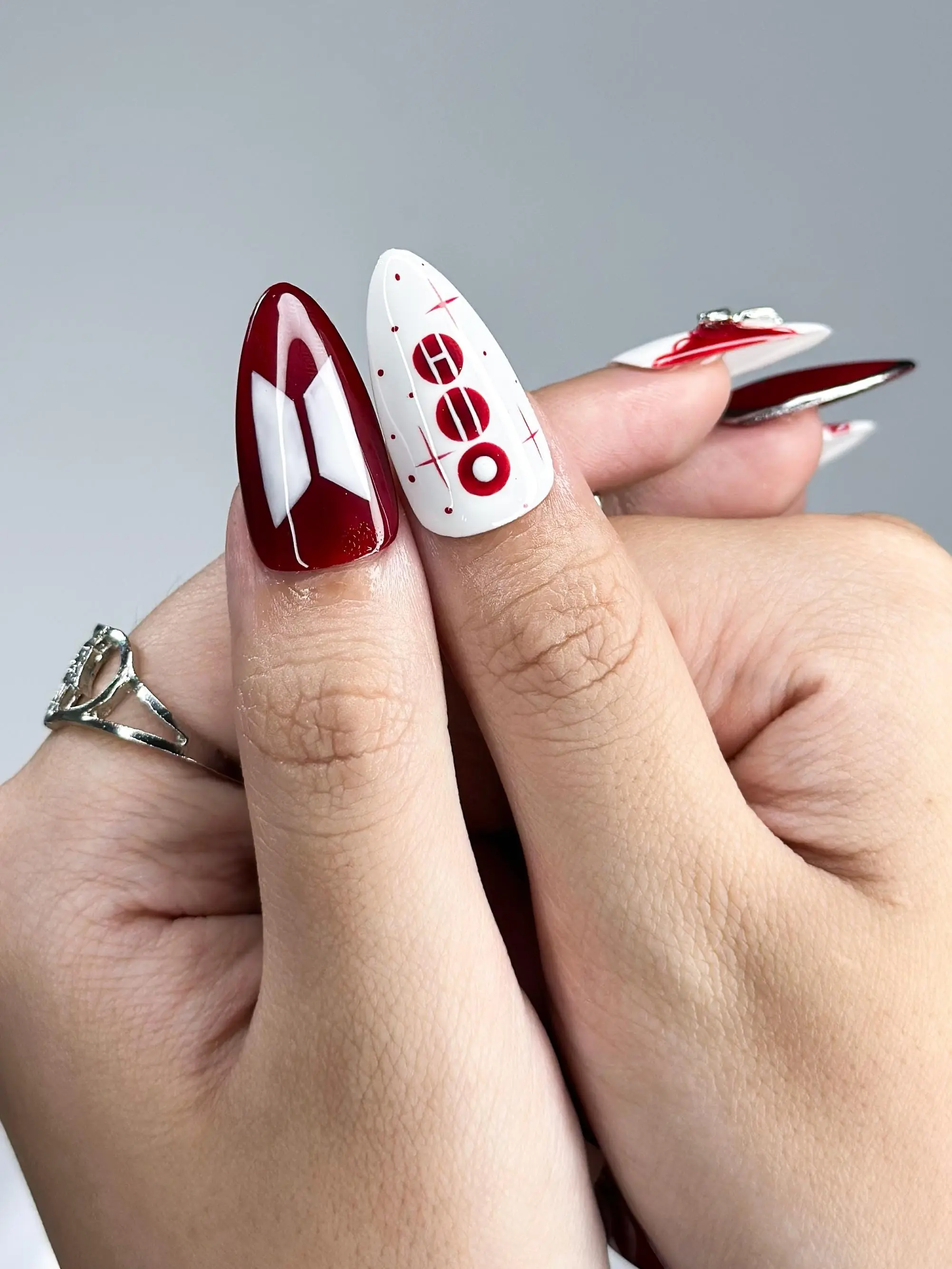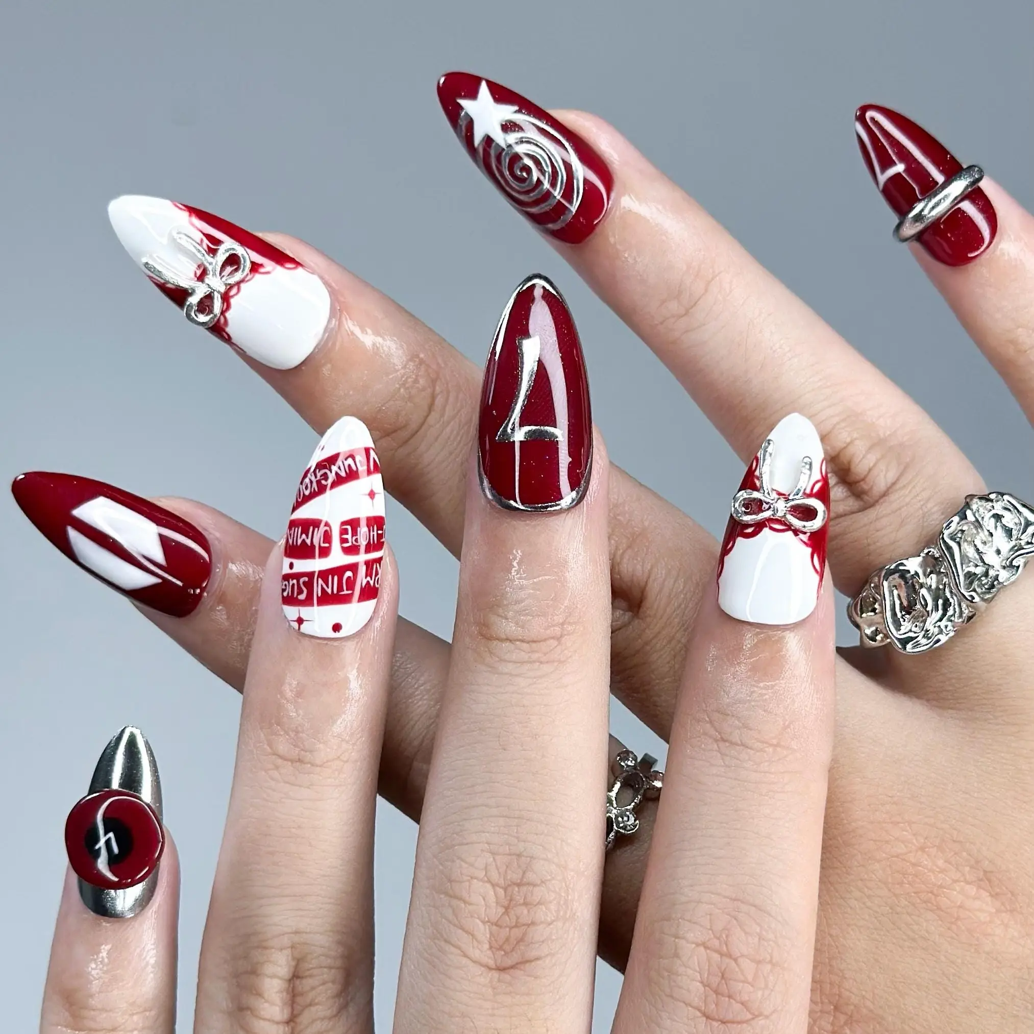 Kpop Inspired Press-On Nails | Red White Silver Retro Bows, 7, Stars