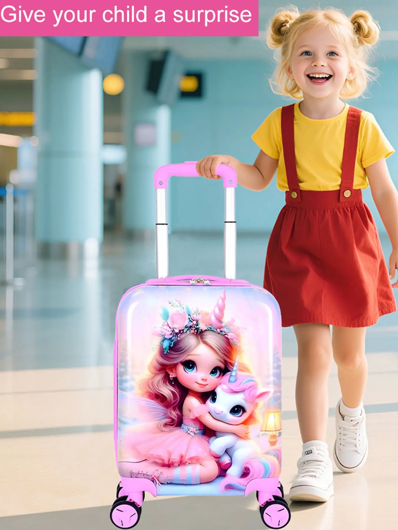 1 Set Kids Luggage Set, Cute Princess & Unicorn Print Hard Shell Suitcase with U-Shaped Neck Pillow, Lightweight Rolling Carry On Luggage for Girls, Travel Trolley Case for School Trip, Vacation, Airplane