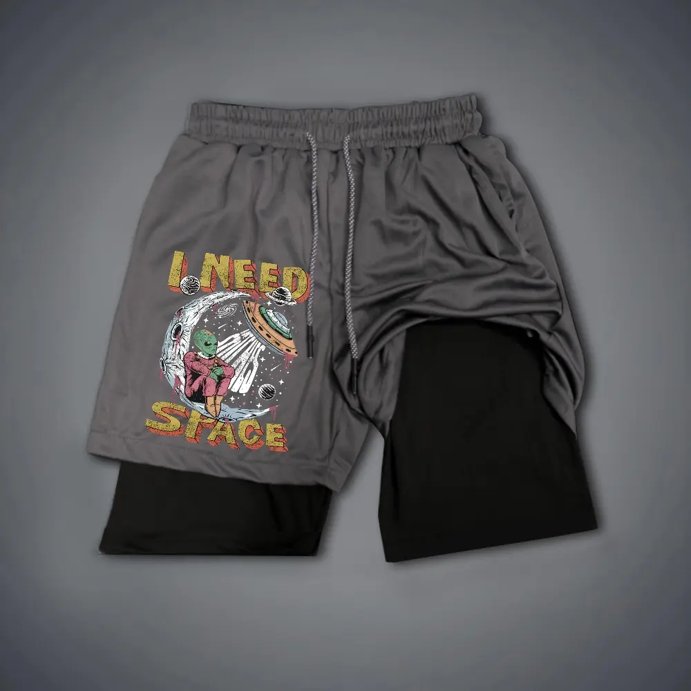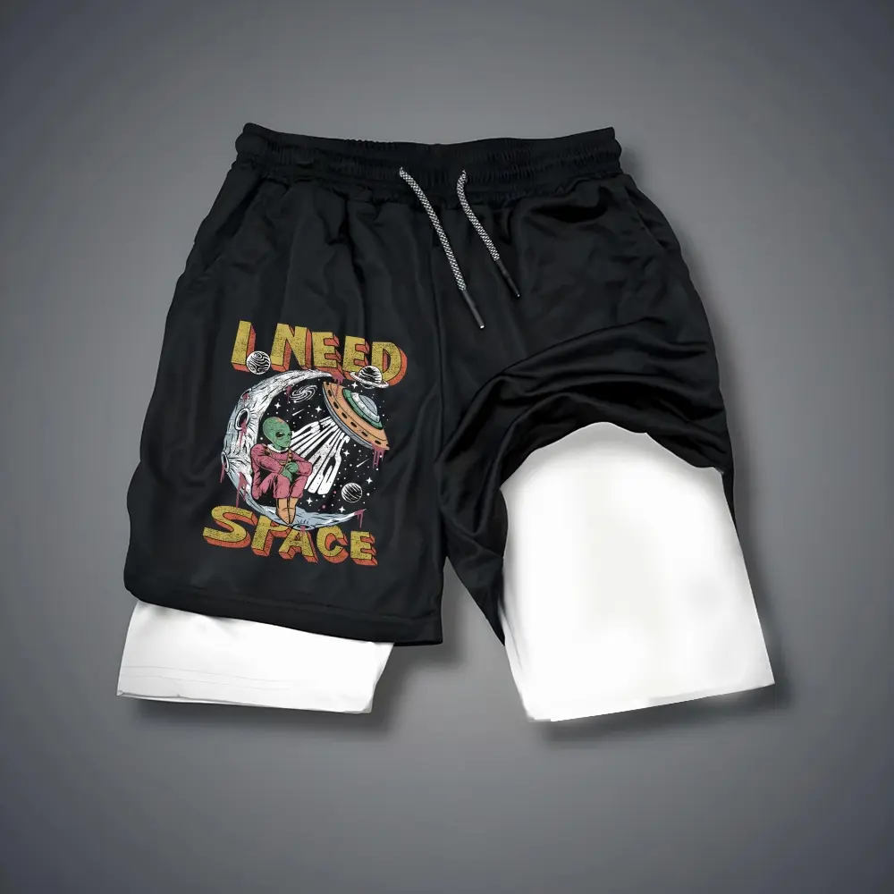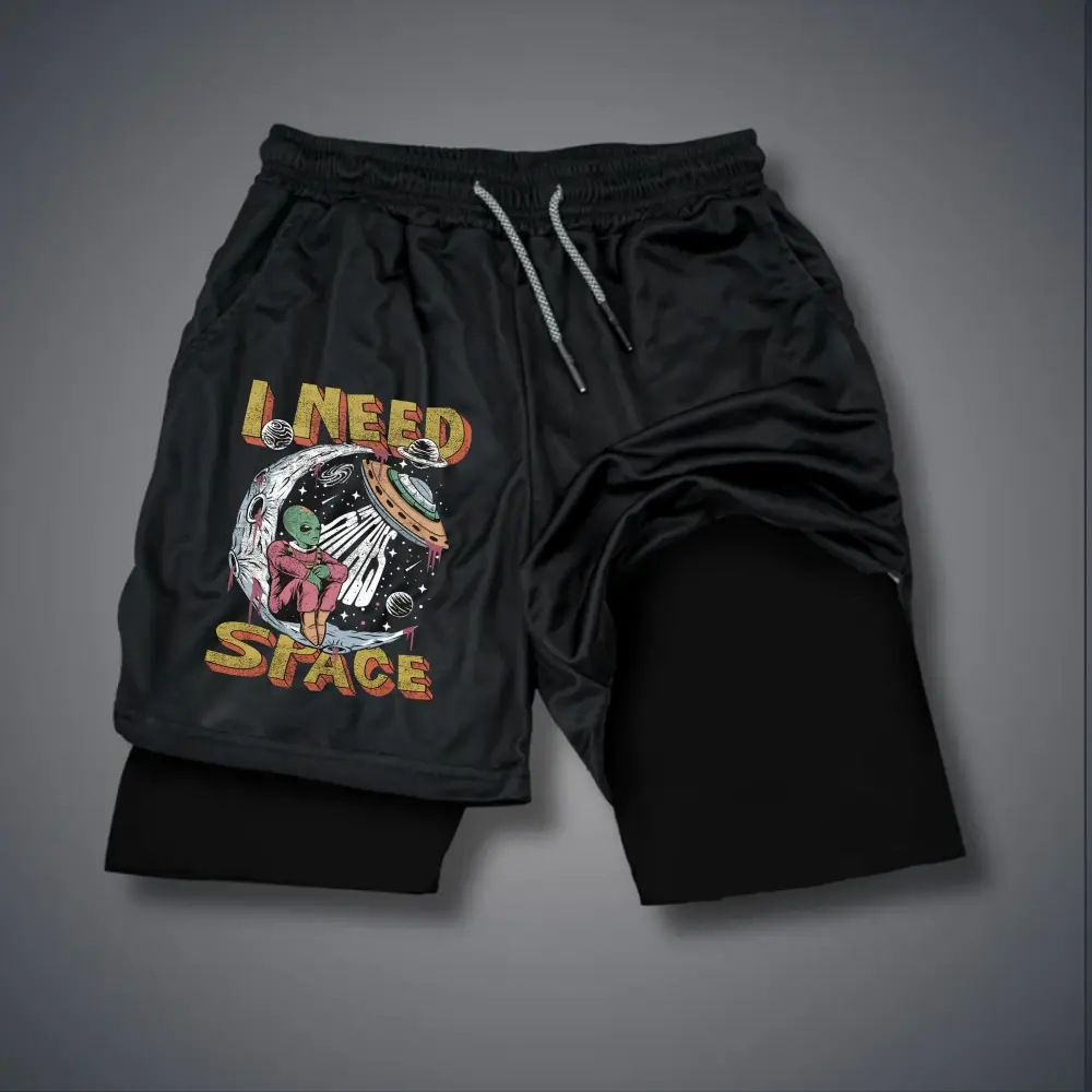"I Need Space" Alien Double Layer Shorts Men, Retro Sci-Fi Graphic Streetwear Shorts, Funny Space Themed Athletic Shorts