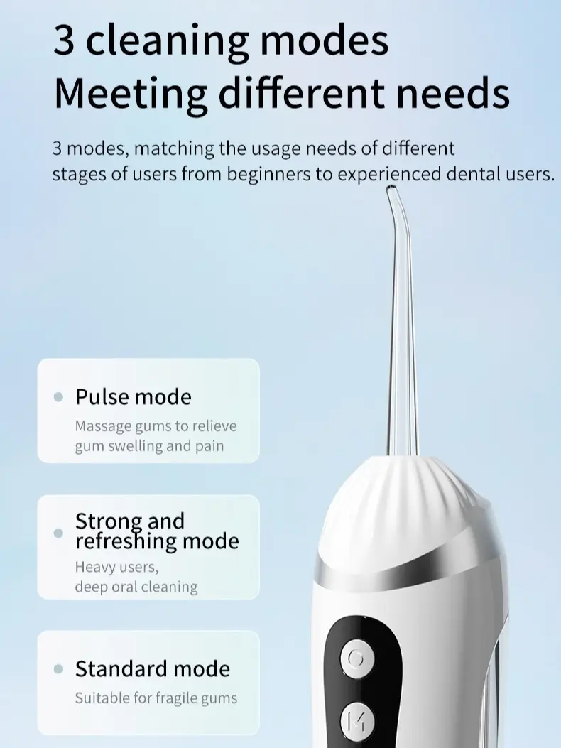 Say goodbye to bleeding gums and hidden food debris with our 3-Second Gradually Strengthen Water Flosser—gentle yet powerful. Designed for sensitive gums, its unique 3-second gradual intensity avoids irritating delicate gum tissue, ideal for gingivitis or sensitive teeth. Powered by professional piston pump, it delivers 1600 times/min pulsating flow to clean gaps, remove plaque and prevent bleeding. The 360° rotating nozzle easily navigates braces, bridges and implants. Made of food-grade BPA-free material, it’s safe for daily use. IPX7 waterproof, rechargeable with 15+ days of battery life and compact for portability. 3 specialized modes (sensitive, daily, braces) are 50% more effective for gum health than traditional floss—elevate your oral care routine.